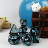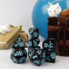 Kocie kości na 20-lecie! Prezentujemy 20-lecie Q Workshop: Koci Zestaw Kości, nowy wariant kolorystyczny dla naszego wymruczanego wzoru. Design pokazuje miski z karmą, kule włóczki, ślady łapek, oraz rozbawione koty na najwyższej ściance każdej kostki. Turkusowe zdobienia na lśniąco-czarnym, zmieszanym z brokatowym pyłem tle symbolizują dwie dekady istnienia naszej firmy.