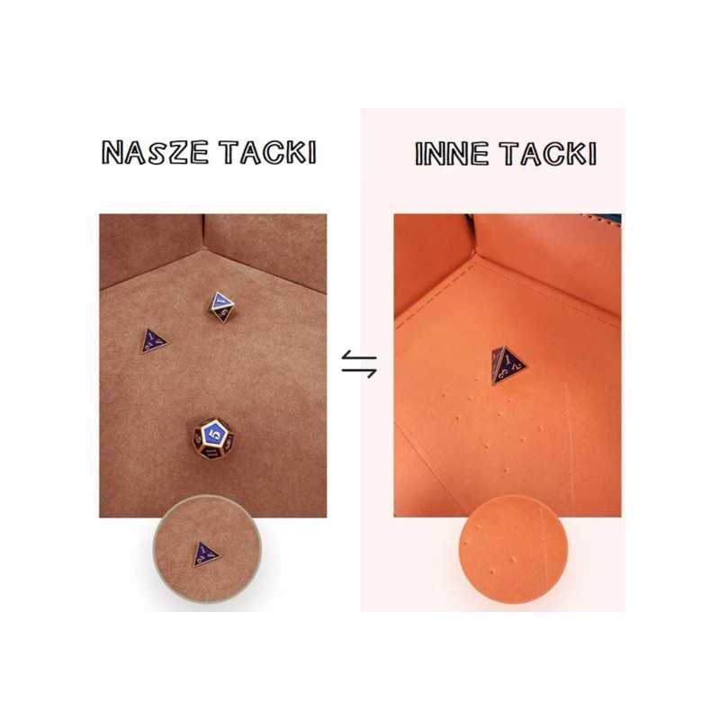 Tacki z oferty RGFK są wyjątkowo uniwersalne. Nadają się do grania w planszówki w każdych warunkach. W ich narożnikach znajdują się metalowe napy, które pozwalają zmienić płaską matę w miseczkę do rzucania kośćmi. Możesz korzystać z nich na dwa sposoby: w formie płaskiego podłoża (w sam raz na stół) lub mniejszej, wyznaczonej przestrzeni ze ściankami.