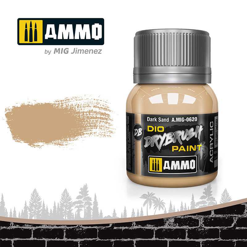 Drybrushing (technika suchego pędzla) to technika modelarska stosowana od dziesięcioleci, nadająca głębi i przestrzenności naszym modelom, podkreślając różne tekstury i detale. Jest to wszechstronna, uniwersalna i łatwa w użyciu metoda pozwalająca uzyskać przekonujący, autentyczny efekt w kilku ruchach.   AMMO: DIO Drybrush to nowa formuła farb specjalnych do drybrushingu. Farby z tej serii cechują się idealną gęstością, wysoką jakością i specyficznymi właściwościami, które czynią je najlepszymi produktami do tej techniki. Słoiczki farb posiadają bardzo szeroką szyjkę, która ułatwia nabieranie farby. Farba stworzona jest na bazie wody, jest łatwa w czyszczeniu, nietoksyczna i bezwonna. Farby wysychają bardzo szybko, modele po pomalowaniu można dotknąć w przeciągu kilku minut. Są odporne na zmywanie olejem.     Produkty Ammo of Mig Jimenez to doskonałe narzędzia dla pasjonatów, znajdziesz tutaj wszystko, czego potrzebujesz do tworzenia niesamowicie realistycznych efektów na swoich modelach i figurkach.