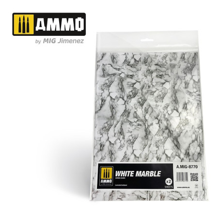 Ammo: White Marble to arkusze odzwierciedlające marmurową posadzkę . Ten produkt sprawdzi się idealnie do odwzorowania efektu podłogi na makietach i podstawkach figurek.