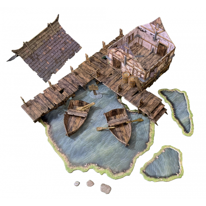 Ci, którzy chcą mieszkać nad brzegiem wody, muszą dostosować swoje domy, kładąc fundamenty na palach w dnie jeziora i budując podniesione drewniane chodniki, aby uzyskać dostęp do swoich łodzi i brzegu.   BattleSystems: Lake House zawiera wszystko, czego potrzebujesz, aby zbudować spokojny dom nad jeziorem, odpowiedni do wielu gier fantasy i historycznych w skali 28-35 mm. Wnętrze jest w pełni szczegółowe, a dach można zdjąć. Zestaw zawiera jezioro, dwa stawy i 18" / 45 cm podniesionych chodników. Wiele elementów jest modułowych i można je montować w różnych kombinacjach lub mieszać i dopasowywać do reszty asortymentu.