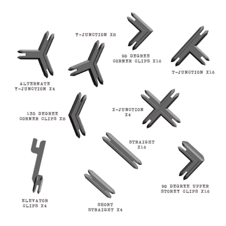 10 prostych, 4 krótkie proste, 16 narożnych, o kącie 90 stopni,  8 narożnych o kącie 135 stopni, 16 w kształcie litery T, 8 w kształcie litery Y, 4 alternatywne w kształcie litery Y, 4 w kształcie litery X, 16 z kątem prostym, 4 klipsy do windy.