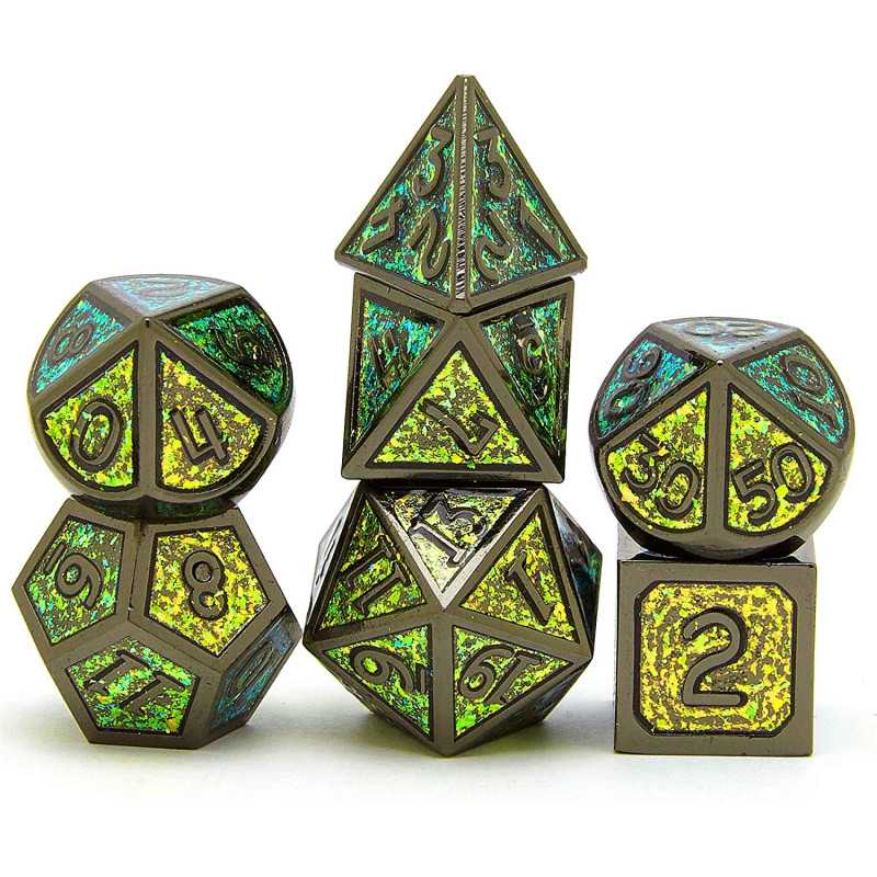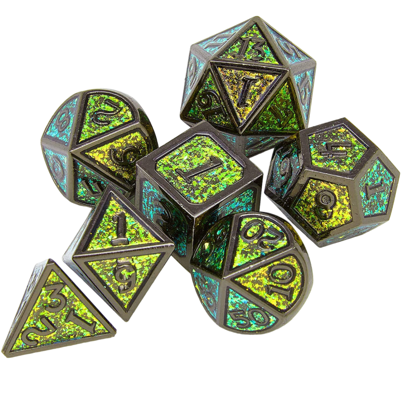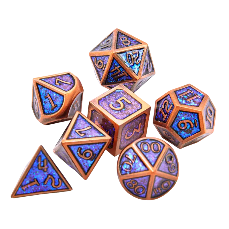 • Dwa zestawy 7 kości wykonanych z metalu. Idealnie nadają się do każdego systemu i dla każdego gracza.