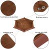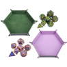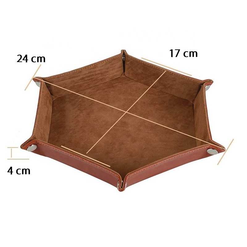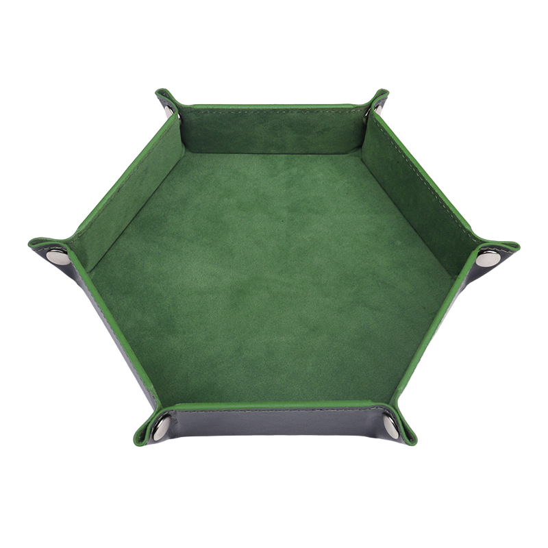 • Dwie tacki 17 cm wykonane ze skóry i aksamitu. Doskonały wybór aby utrzymać kostki w jednym miejscu i wygłuszyć dźwięk ich toczenia się. Dice tray jest wykonany ze skóry, a w środku wyłożony aksamitem. W narożnikach znajdują się wytrzymałe, metalowe napy dzięki którym możemy płaską matę zmienić w miseczkę do rzucania kośćmi. Materiał: Skaj