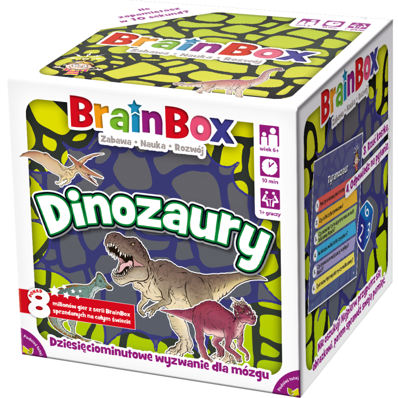 To prawdziwa gratka dla wszystkich fanów dinozaurów! Gra pełna jest ciekawostek o tych prehistorycznych stworzeniach. Gry z serii BrainBox stanowią doskonałe ćwiczenie pamięci! BrainBoxy są dostosowane do wspólnej zabawy dzieci i dorosłych, by była ona satysfakcjonująca dla obu stron. Gry powstają w etycznych warunkach, z materiałów pochodzących z recyklingu i zdatnych do ponownego przetworzenia.
