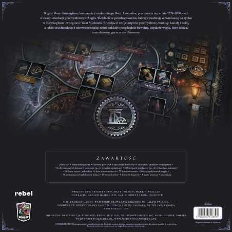 Na czym to polega? Rozgrywka w Brass: Birmingham dzieli się na dwie części: erę kanałów (17701830) i erę kolei (18301870). Każda era składa się z rund 8-10 rund (ich liczba różni się w zależności od liczby uczestników). W każdej rundzie gracze rozgrywają swoje tury zgodnie z kolejnością ich żetonów na specjalnym torze. W swojej turze gracz wykonuje dwie wybrane akcje. Znajdziemy wśród nich możliwość wznoszenia zakładów przemysłowych i ich rozwijania, rozbudowywanie sieci połączeń kolejowych, sprzedaż dóbr, wzięcie pożyczki oraz wymianę kart. Zwycięży osoba, która po zakończeniu drugiej ery będzie mieć najwięcej punktów zwycięstwa za żetony połączeń i odwrócone żetony zakładów. Zawartość: plansza 4 planszetki graczy 4 żetony postaci 4 znaczniki dochodu 4 znaczniki punktów zwycięstwa 56 dwustronnych żetonów połączeń (po 14 w każdym kolorze) 180 żetonów zakładów (po 45 w każdym kolorze) 64 karty miast i zakładów 8 kart uniwersalnych 77 żetonów monet 30 czarnych kostek węgla 18 pomarańczowych kostek żelaza 15 beczek piwa 9 żetonów kupców 4 karty pomocy instrukcja