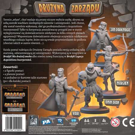Każda postać należąca do Drużyny Zarządu posiada swoją figurkę oraz unikalną talię startową, odwzorowującą jej umiejętności. Wykorzystaj ją w rozgrywce Brzdęk! Nie drażnij smoka albo otwórz nową franczyzę w Brzdęk! Legacy: Acquisitions Incorporated.