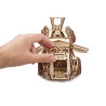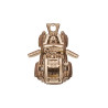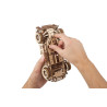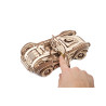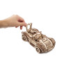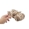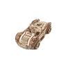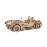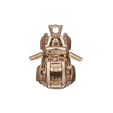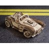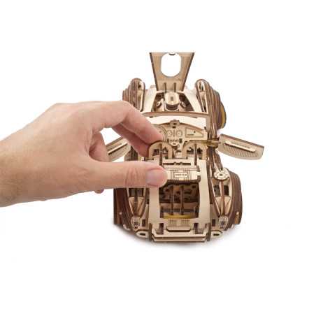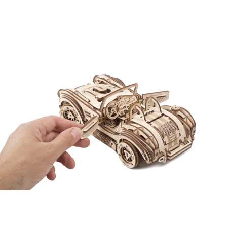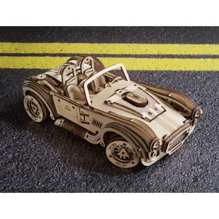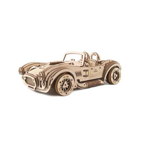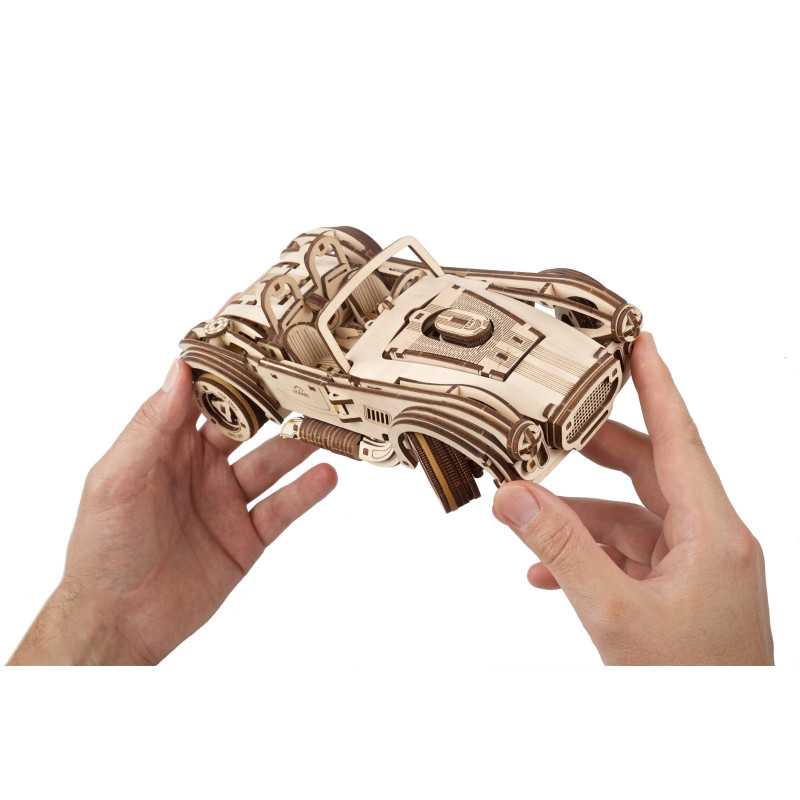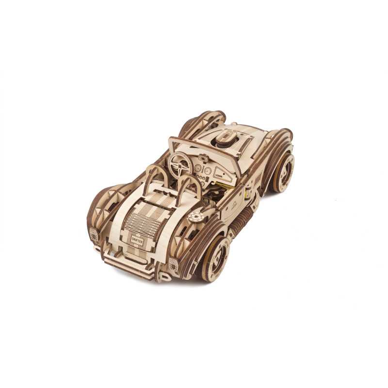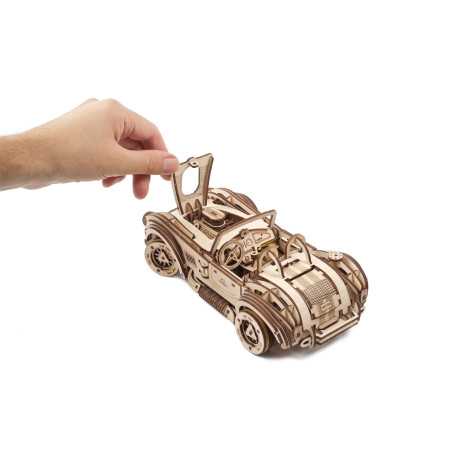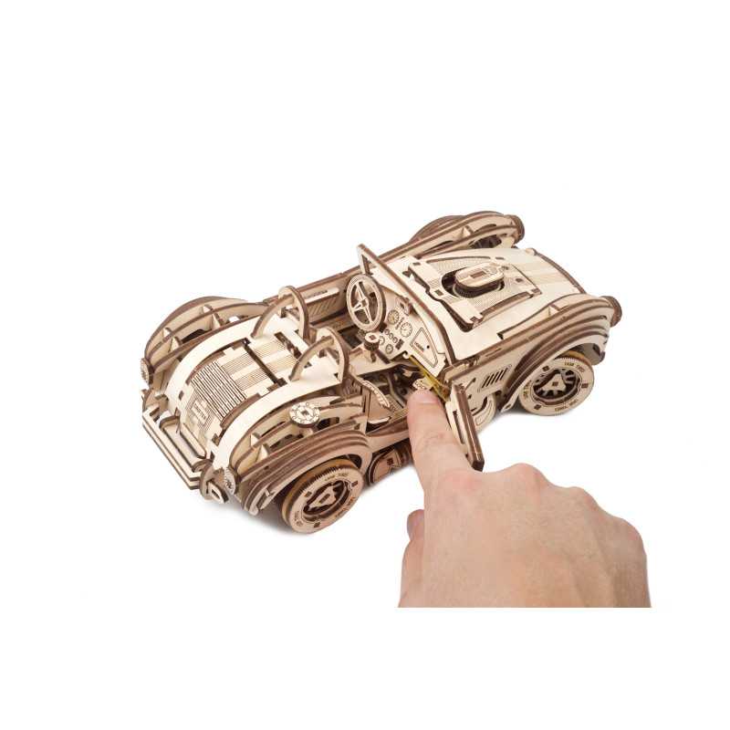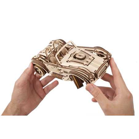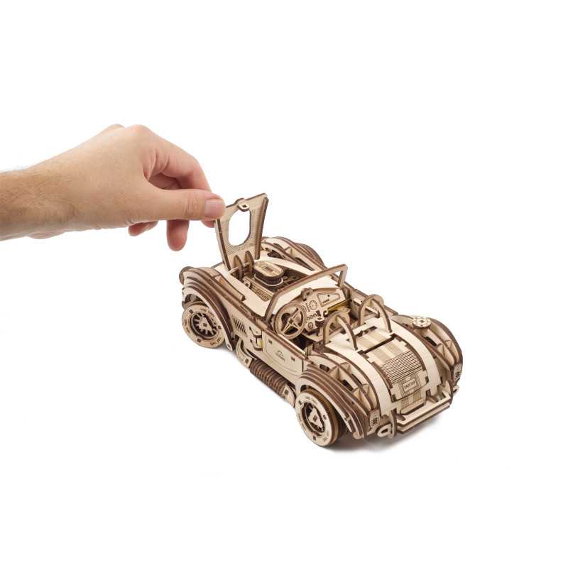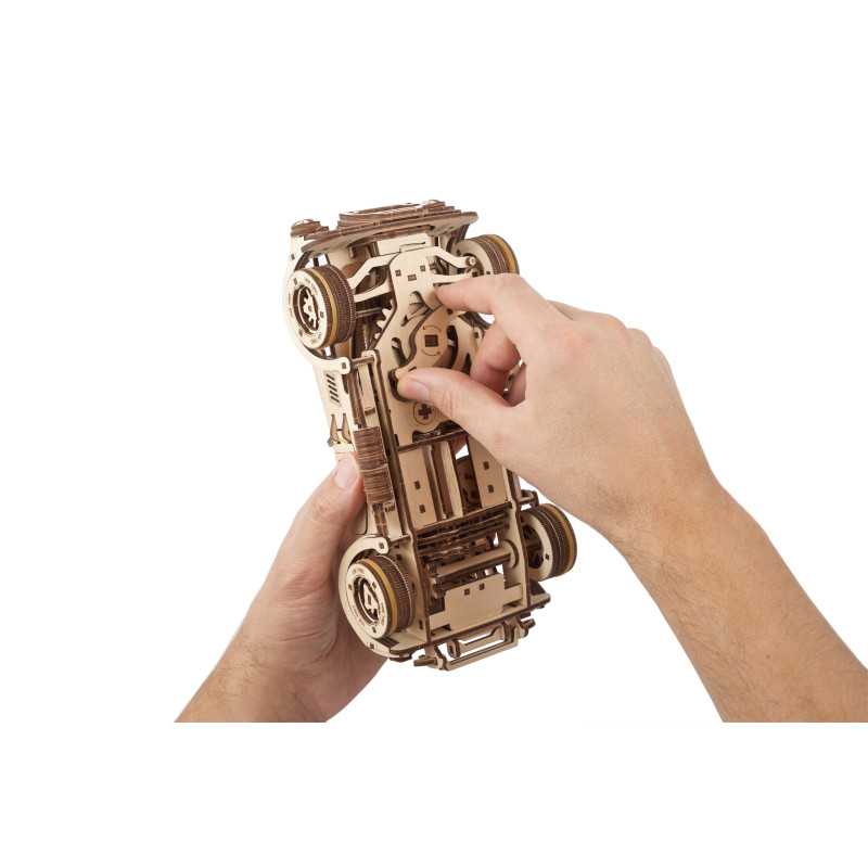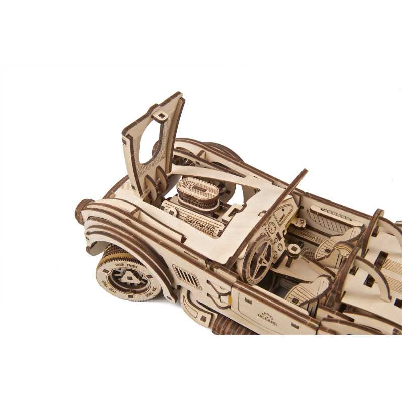 Uważamy, że ten model 3D do składania puzzli / majsterkowania jest piękny, z grubymi oponami, wybujałymi krzywiznami (dzięki kawałkom precyzyjnie wyciętym laserowo z cienkiej sklejki o grubości 1 mm), wielką otwartą paszczą z przodu i otwartym dachem kabrioletu. Ruchome części tego drewnianego samochodu to obracające się przednie koła, otwierane drzwi oraz podnoszona maska i bagażnik. Zamiast gumowego silnika zastosowaliśmy mocny mechanizm sprężynowy, który dodaje modelowi “siły” i wydłuża jego żywotność. Mechanizm zapadkowy sprawia, że nie musisz trzymać gałki przez cały czas nawijania modelu. Energia potencjalna jest magazynowana z każdym obrotem, bez poślizgu, aż do momentu, gdy silna wewnętrzna sprężyna zostanie w pełni nakręcona.