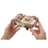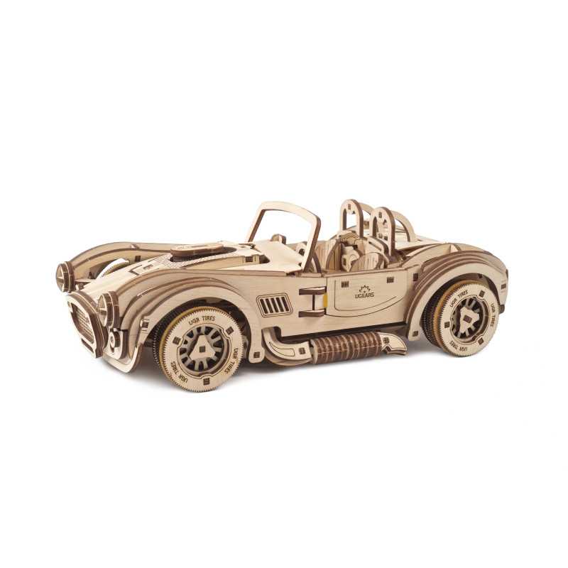 Napędzany potężnym silnikiem sprężynowym, samochód wyścigowy Ugears Drift Cobra ma najszybszy zespół koni pod maską spośród wszystkich mechanicznych modeli drewnianych, jakie znamy. Model jest nakręcany za pomocą pokrętła z zapadką znajdującego się pod podwoziem. Przed nakręceniem swojego trójwymiarowego drewnianego modelu samochodu wyścigowego Drift Cobra przesuń filtr powietrza, który wystaje z maski w kierunku przedniej szyby. A przełącznik znajdujący się przed siedzeniem po stronie pasażera ustaw w pozycji Lock (równolegle do drzwi). Teraz przekręć zapadkę pod nadwoziem samochodu. Po 6 do 6,5 obrotach sprężyna jest w pełni nakręcona i – vroom! vroom! – Twoja wyścigówka jest gotowa do ryku! Ustaw dźwignię zmiany biegów, znajdującą się pomiędzy siedzeniami kierowcy i pasażera, w żądanej pozycji (Reverse, Neutral, Drive). Aby uruchomić model, połóż go na płaskiej powierzchni, przesuń filtr powietrza do przodu i obserwuj, jak Twoja Cobra pali gumę na torze (zacznij z kołami obróconymi w jedną stronę), robi kółka lub przyspiesza w linii prostej.