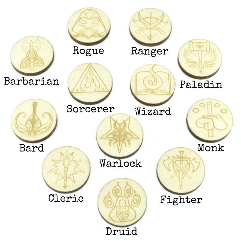 Zestaw 12 żetonów o średnicy 24 mm, wykonanych ze sklejki brzozowej o grubości 3 mm. Żetony z symbolicznymi rysunkami klas postaci do gier takich jak Dungeons & Dragons, Warhammer i innych.