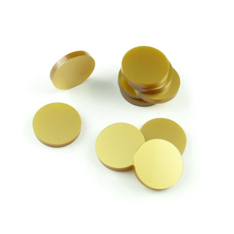 Zestaw 10 żetonów o średnicy 22 mm, wykonanych ze szkła akrylowego o grubości 3 mm. Powierzchnia mieni się w sposób imitujący metale szlachetne.