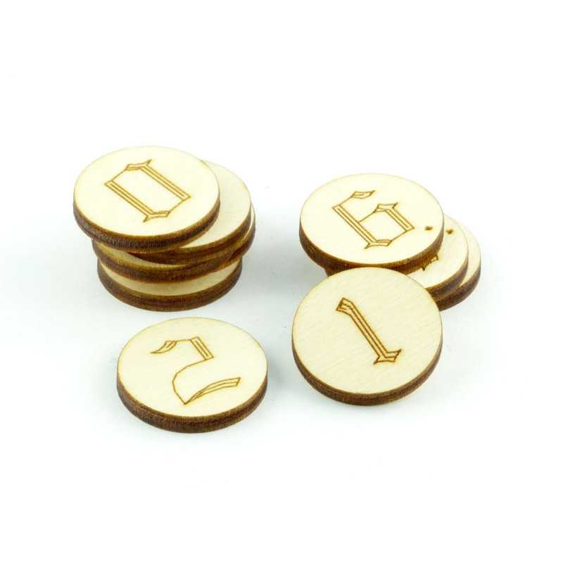 Zestaw 10 żetonów o średnicy 22 mm, wykonanych ze sklejki brzozowej o grubości 3 mm.