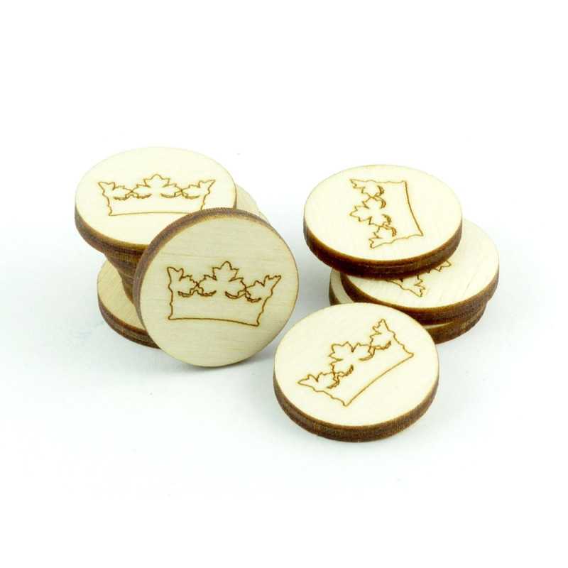 Zestaw 10 żetonów o średnicy 22 mm, wykonanych ze sklejki brzozowej o grubości 3 mm.