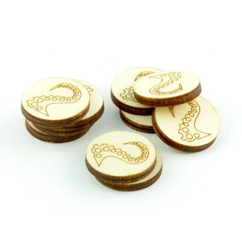 Zestaw 10 żetonów o średnicy 22 mm, wykonanych ze sklejki brzozowej o grubości 3 mm.