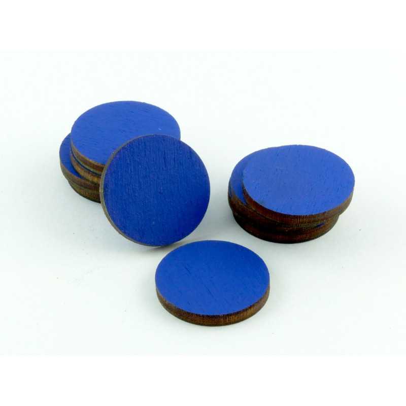 Zestaw 10 żetonów o średnicy 22 mm, wykonanych ze sklejki brzozowej o grubości 3 mm.