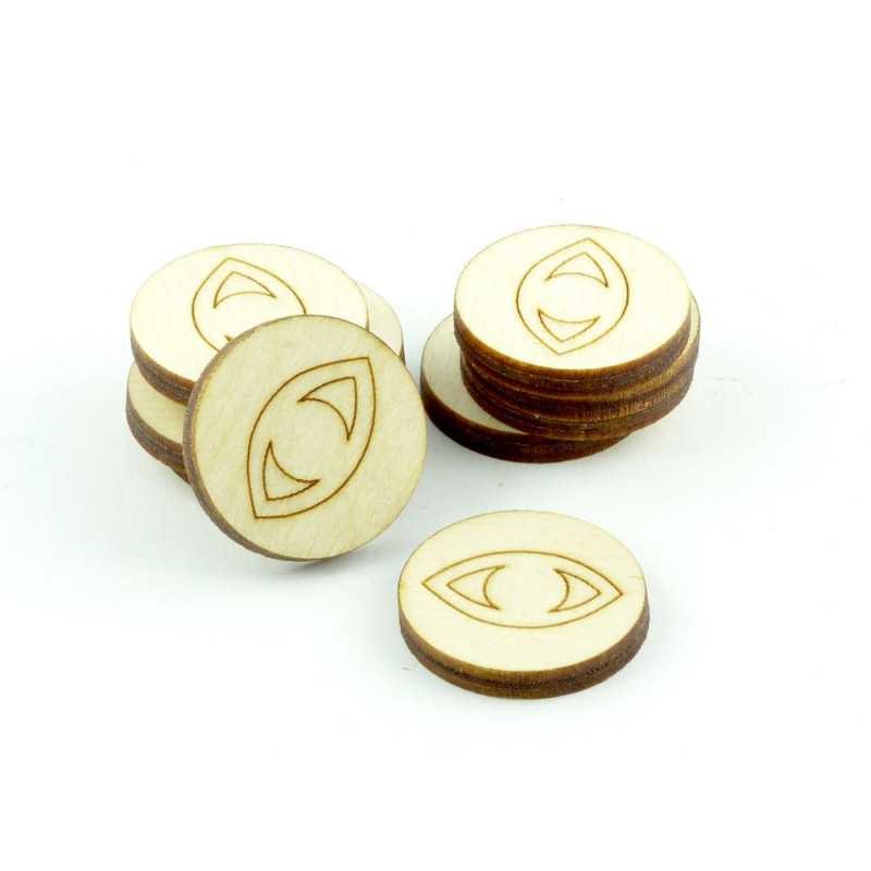 Zestaw 10 żetonów o średnicy 22 mm, wykonanych ze sklejki brzozowej o grubości 3 mm.
