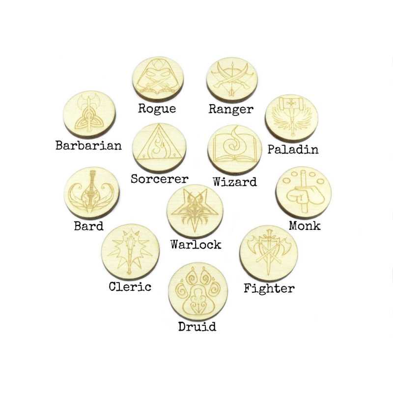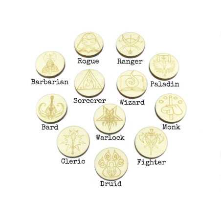 Żetony z symbolicznymi rysunkami klas postaci do gier takich jak Dungeons & Dragons, Warhammer i innych. Żetony mają średnicę 25 mm i są wykonane z grawerowanej sklejki brzozowej. Na żetonach przedstawiono klasy: