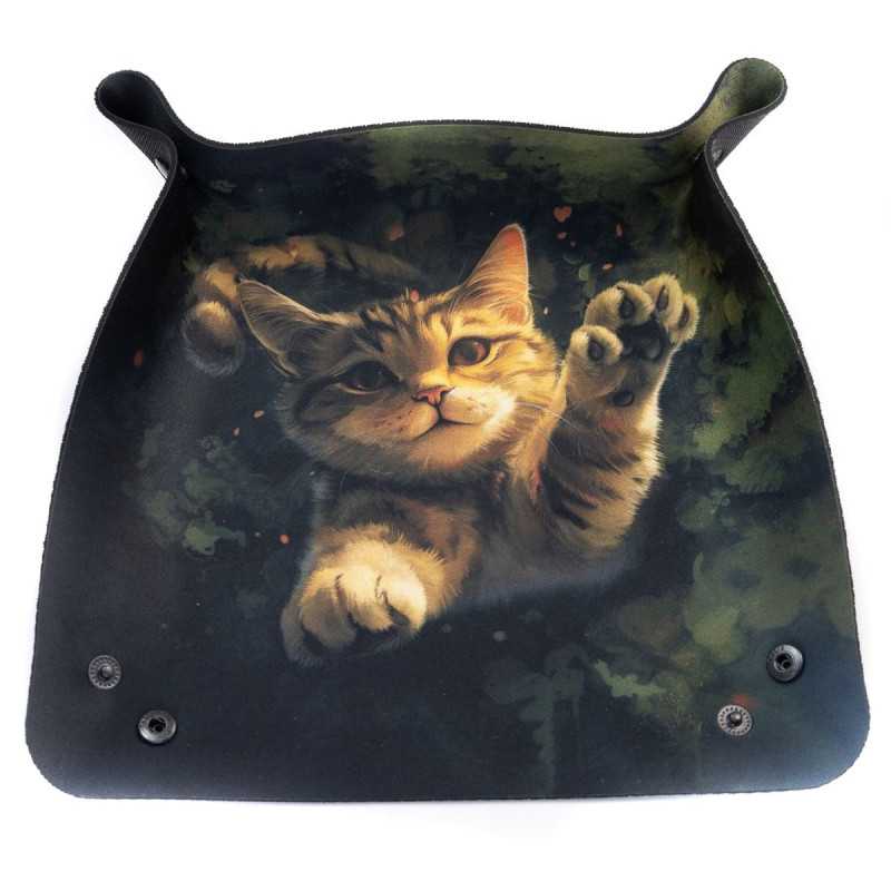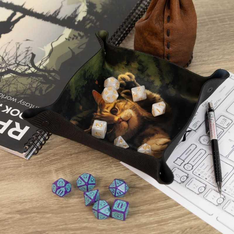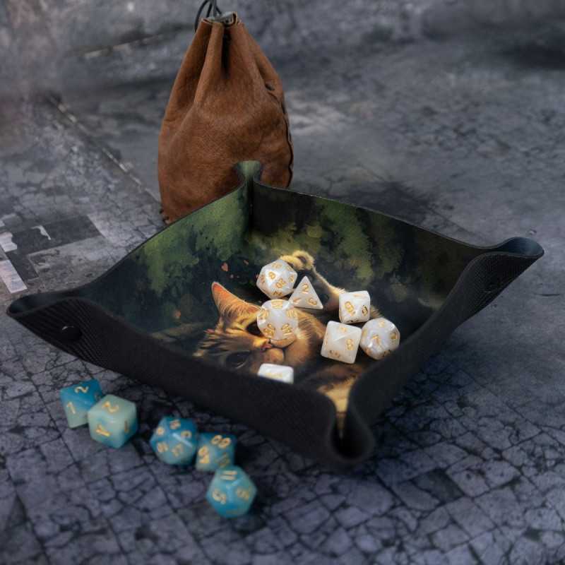 Dodaj odrobinę uroku do swoich sesji RPG z tacką na kości "Playing Cat". Wykonana z trwałego materiału i ozdobiona uroczym wzorem bawiącego się kota, ta tacka nie tylko chroni Twoje kości przed zgubieniem, ale także wprowadza przyjemną atmosferę do gry. Wygodne zatrzaski umożliwiają szybkie składanie i rozkładanie.