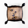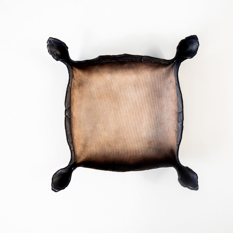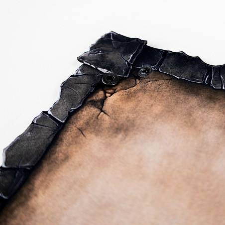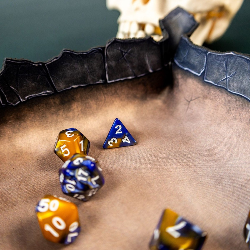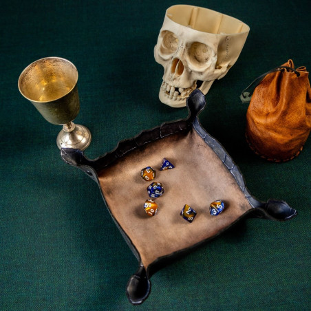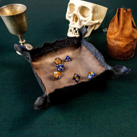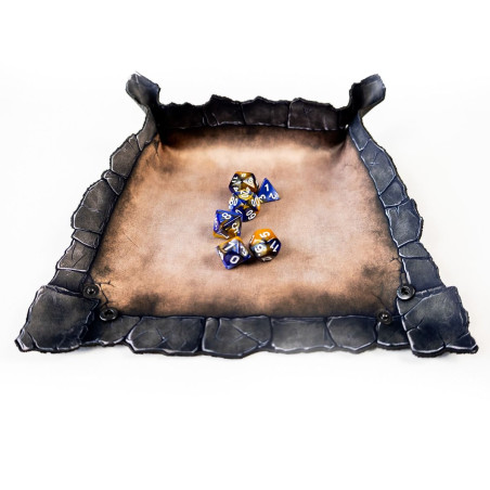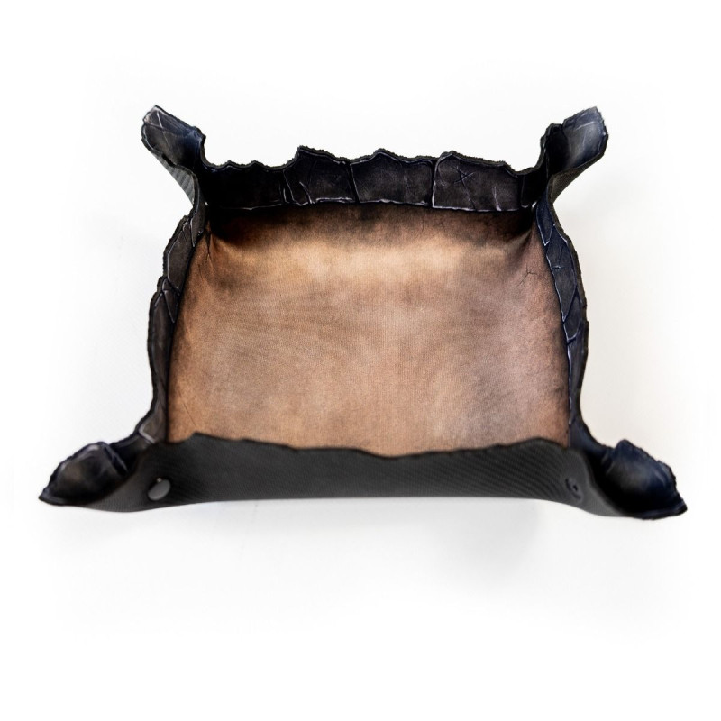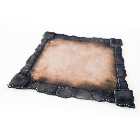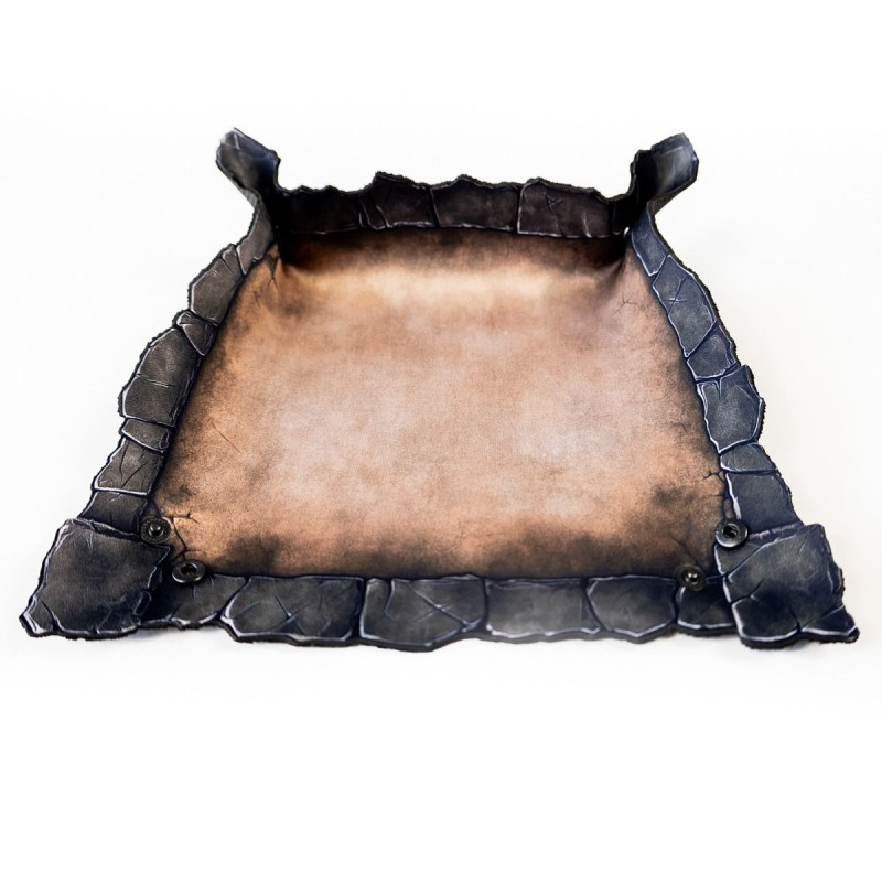 Wykonana z trwałej gumy o grubości 2 mm, tacka jest odporna na zagniecenia, rolowanie w plecaku i szaleństwa pechowych rzutów. Wewnętrzna powierzchnia z jednostronnym nadrukiem w kolorze postarzanego brązu przypomina stary, wypłowiały kamień. Ale prawdziwy atut to ranty - ich kształt nie jest przypadkowy. Nieregularne, przypominające pęknięcia w skalnej krawędzi dodają klimatu i naturalnie zatrzymują toczące się kostki.