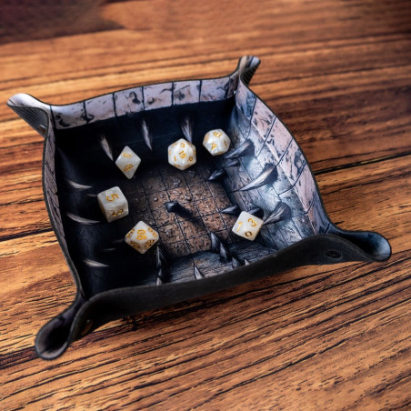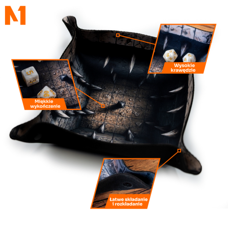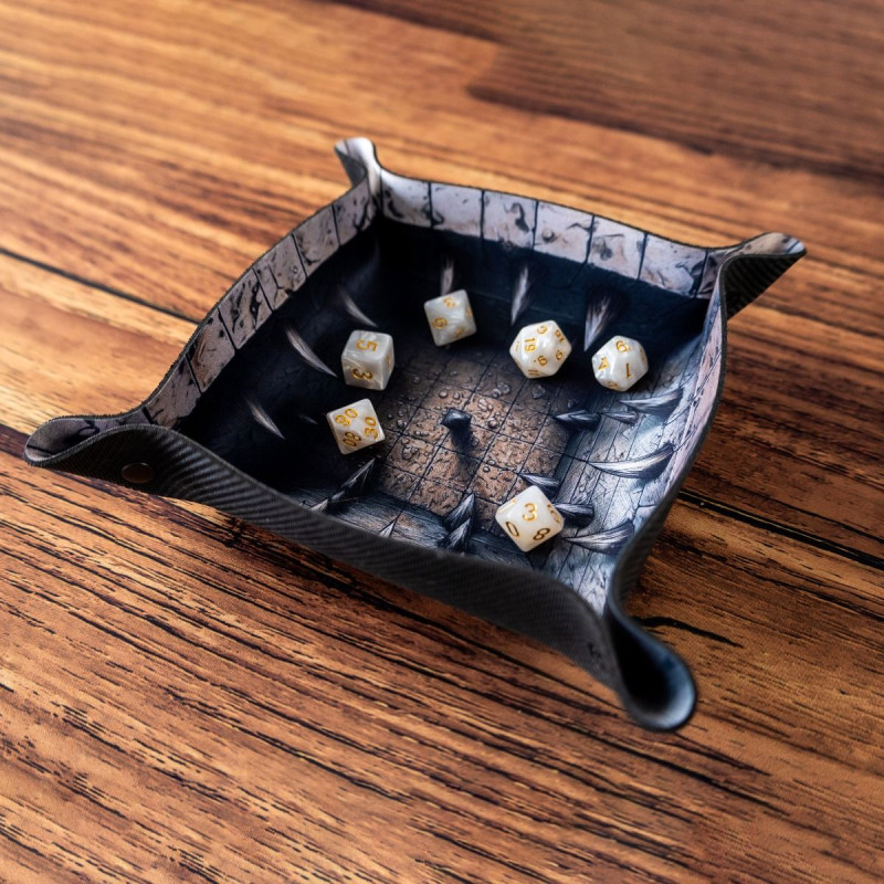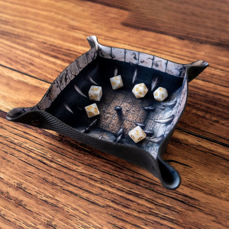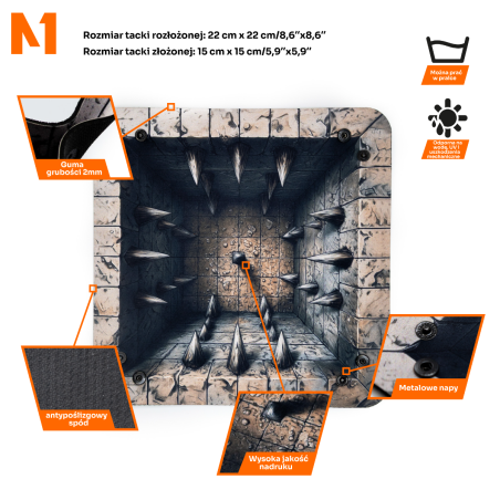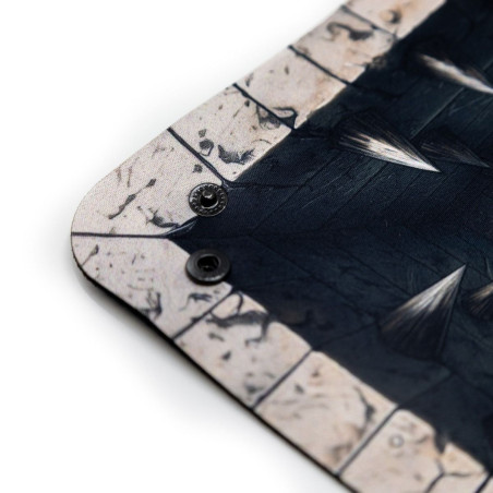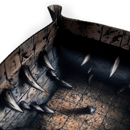 Tacka do rzutów kostkami z grafiką rodem z lochów pełnych kolców. Gumowa, składana na napy, tłumi hałas i chroni komponenty. Idealna do sesji fantasy RPG, takich jak Dungeons & Dragons, Pathfinder czy Shadowdark.