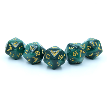 Zestaw zawiera pięć dwudziestościennych kości o zielonkawym kolorze (marbled) i złotej numeracji.
