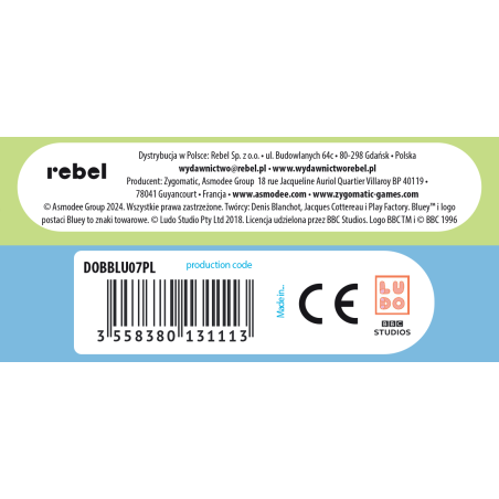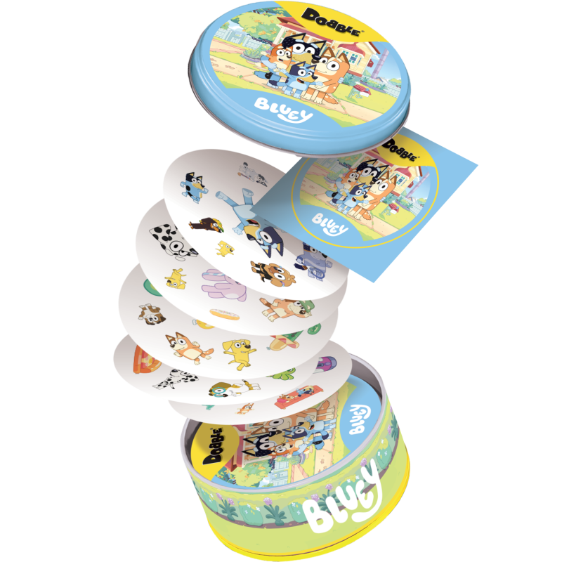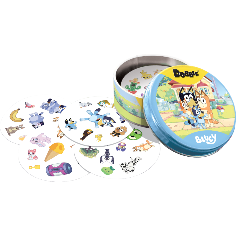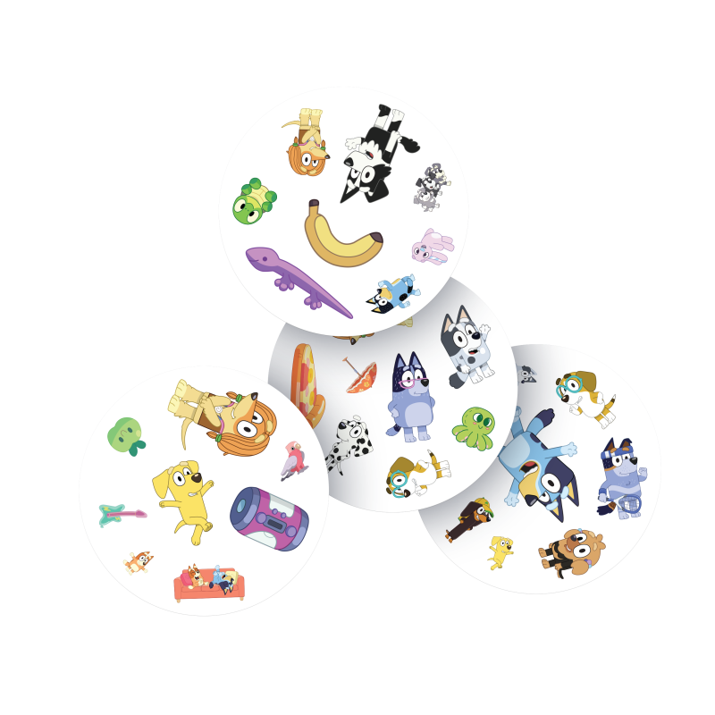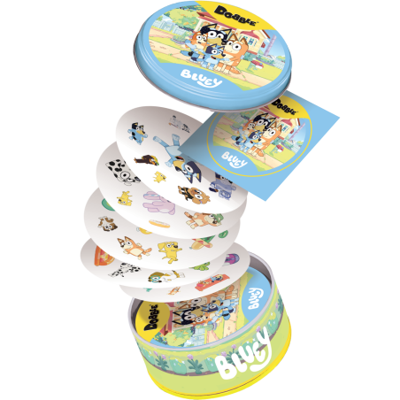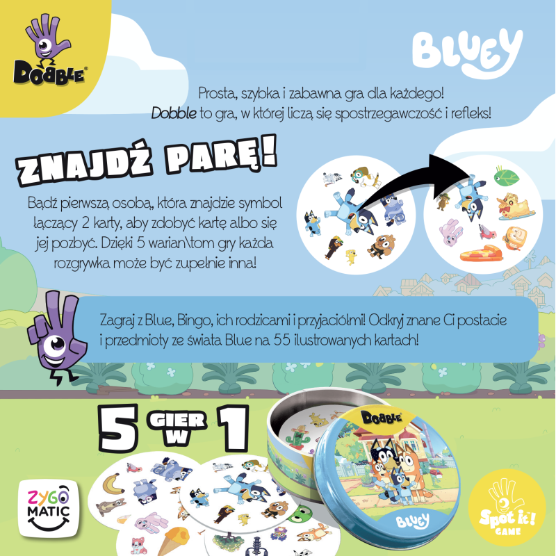 Blue, Bingo i ich rodzice zapraszają do wspólnej zabawy! Zebrali najważniejsze rzeczy, a po drodze zawitali na karty Dobble, by cieszyć najmłodszych i zachęcać ich do rozwijania refleksu i spostrzegawczości. Na 55 okrągłych kartach znajdziemy zarówno kultowe postacie, jak i charakterystyczne przedmioty. Czy uda Ci się wypatrzyć identyczne obrazki zanim zrobią to przeciwnicy?