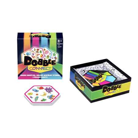 Dobble Connect to zupełnie nowa odsłona rodzinnej gry karcianej, w której ćwiczymy refleks i spostrzegawczość. Naszym celem jest ułożenie 4 kart w swoim kolorze tak, by tworzyły nieprzerwaną linię – poziomą, pionową lub na skos. Aby dołożyć kolejną kartę do wzoru, musimy znaleźć wspólny symbol, łączący ją z jedną z kart, do której chcemy ją przyłączyć. Kto pierwszy, ten lepszy!