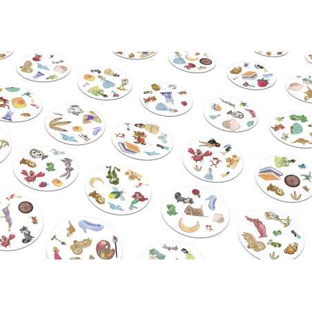Spójrz na pierwszą kartę, którą trzymasz w ręku oraz na tę, która leży na środku stołu. Znajdź na nich wspólny symbol, nazwij go i szybko pozbądź się swojej karty. Teraz następna! Tylko nie zwątp, dwie dowolne karty zawsze łączy jeden wspólny obrazek.