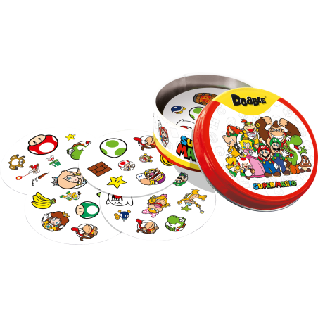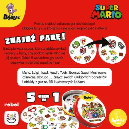 W Dobble można grać na wiele sposobów, a 5 z nich jest opisanych w instrukcji jako minigry. Dodatkowo, aby utrudnić zabawę, symbole na kartach bywają odwrócone i miewają różne rozmiary. Same karty są okrągłe i kolorowe, a każda z nich ma unikalny zestaw symboli związanych ze światem Super Mario.Dlaczego pokochasz tę grę? Przyjrzyj się obrazkom, znajdź parę, przejdź do kolejnej karty. Wydaje się proste, prawda? Ale pary nie są tak oczywiste: obrazki na kartach są różnej wielkości, odwrócone, a przede wszystkim otoczone zupełnie innymi grafikami, co potrafi zmylić nawet najbardziej spostrzegawczych graczy! Żadna inna gra nie rozrusza towarzystwa tak jak Dobble. Żadna nie jest tak prosta i nie daje tyle zabawy w ciągu tych kilku minut! Rozgrywka jest bardzo szybka, emocjonująca, a przy stole dużo się dzieje, gdy każdy próbuje wyprzedzić innych uczestników w wyścigu do zwycięstwa. Zawartość: 55 okrągłych kart puszka instrukcja