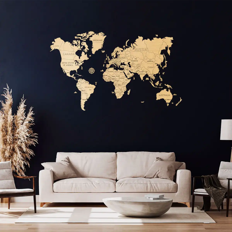 Jej rozmiar, design i czysty geniusz rzemiosła sprawiają, że Mapa Świata XL podnosi poziom dekoracji każdego miejsca, w którym się znajduje. Czy to biuro, salon, czy gabinet, to coś więcej niż ozdobny przedmiot; to początek rozmowy, opowieść o przygodach, które czekają na swoją kolej.