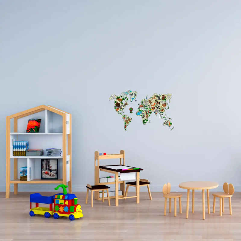 Przedstawiamy Mapa Świata Zwierząt Na Ścianę 3D M, harmonijne połączenie kreatywności, edukacji i rzemiosła. Skonstruowana z brzozy, ta mapa to więcej niż tylko ozdobny element; to interaktywna platforma edukacyjna zdobiona zwierzętami z każdego zakątka naszej planety.