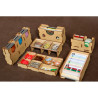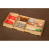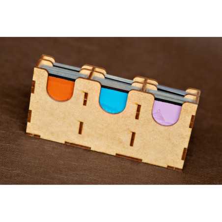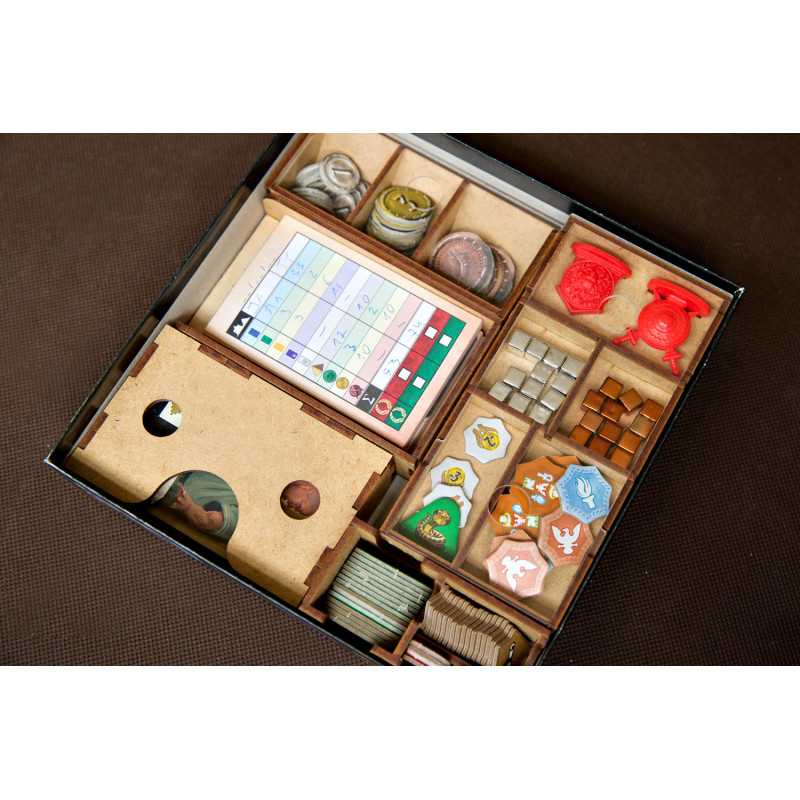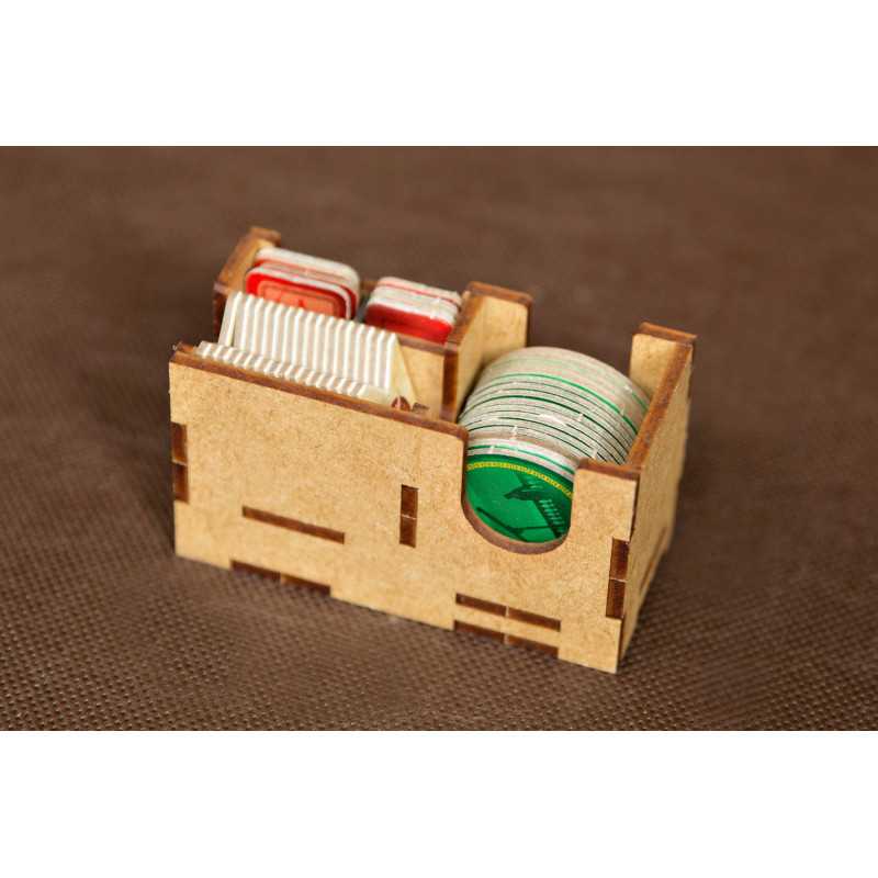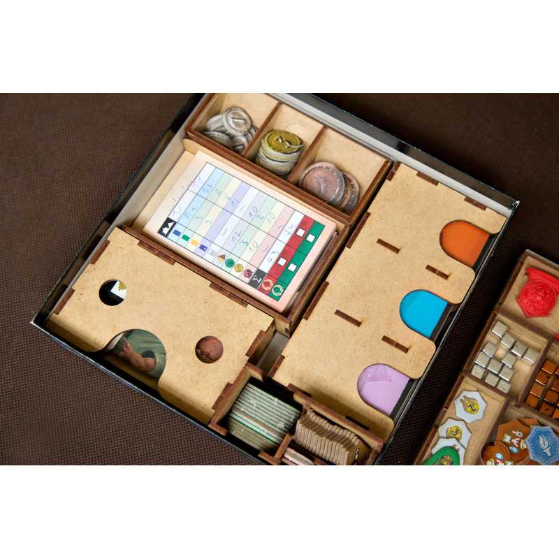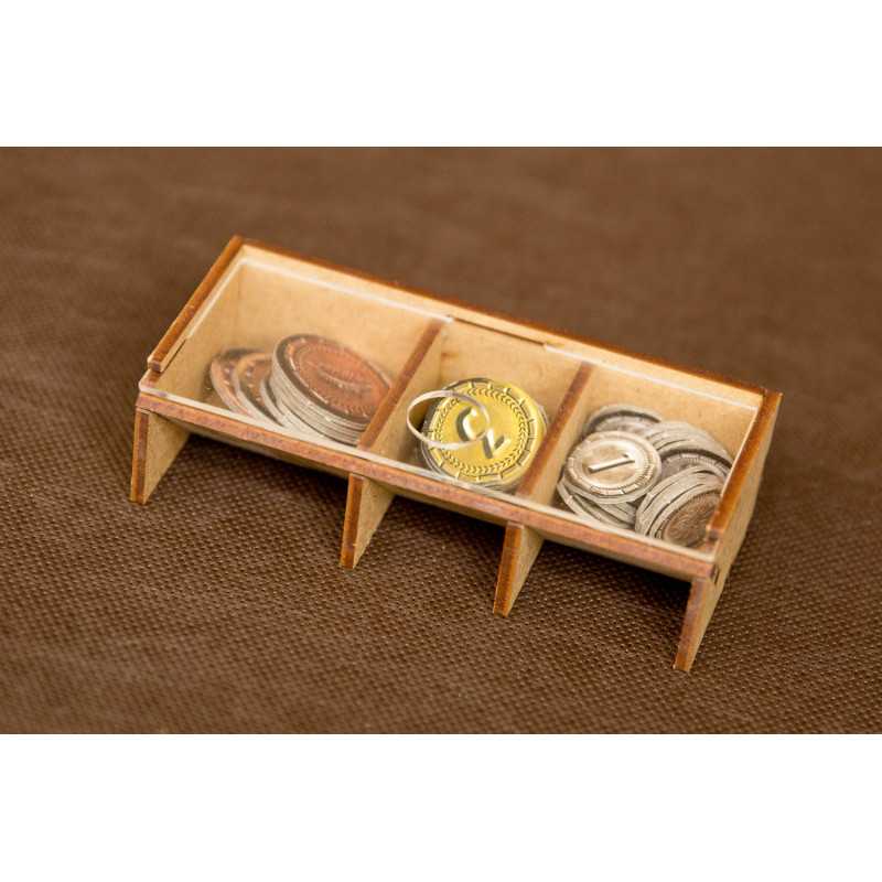 Pojemniki na monety i na elementy z dodatków wraz z pionami konfliktu i Minewry posiadają zasuwki z pleksi. Takie rozwiązanie umożliwia przechowywanie pudełka w pionie i zawartość pojemników nigdy się Wam nie wysypie (bez względu na to czy posiadacie dodatki czy też nie).