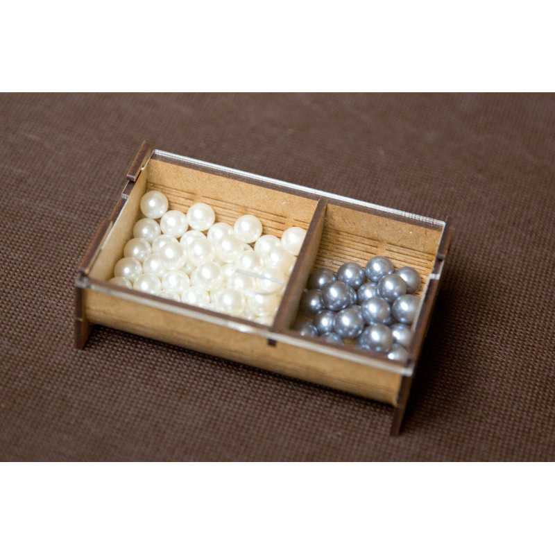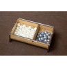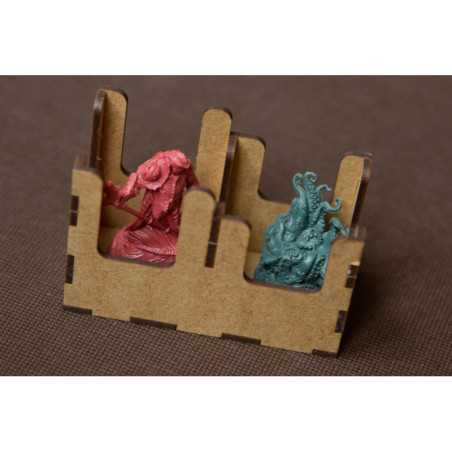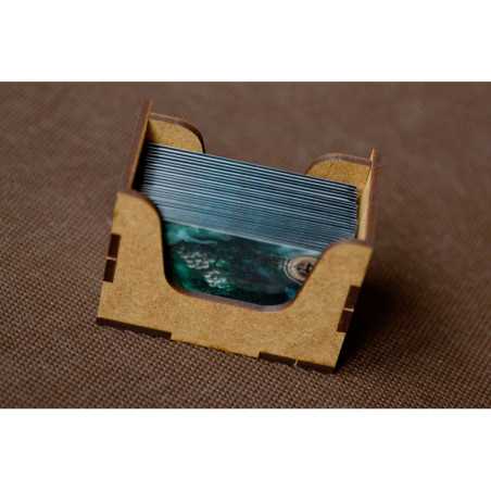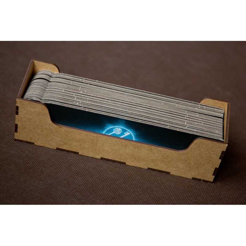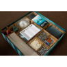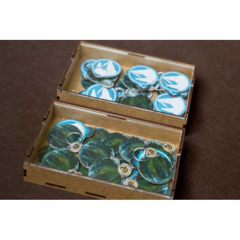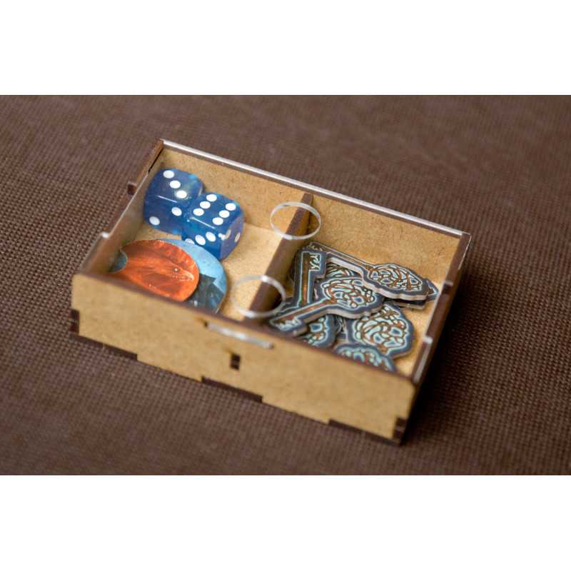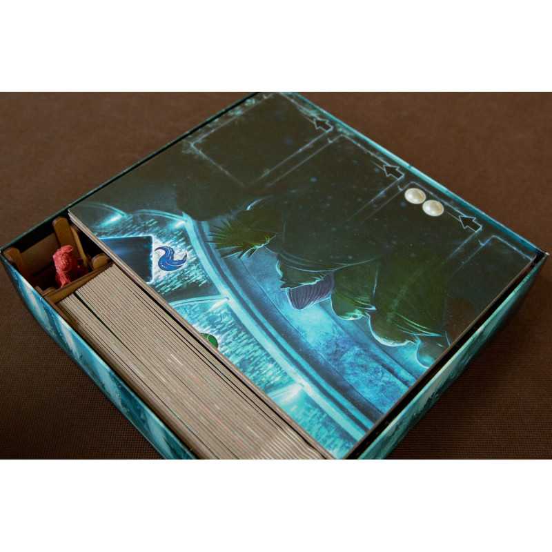 Pojemniki na żetony, kości oraz perły i nebulisy posiadają zasuwki z pleksi. Takie rozwiązanie umożliwia przechowywanie pudełka w pionie i zawartość pojemników nigdy się Wam nie wysypie (bez względu na to czy posiadacie dodatki czy też nie). Pojemniki na karty jednocześnie pełnią funkcję podajników - przyspiesza to rozłożenie gry oraz zabezpiecza Wasze stosy kart w koszulkach przed ich "rozjeżdżaniem się".