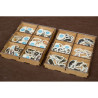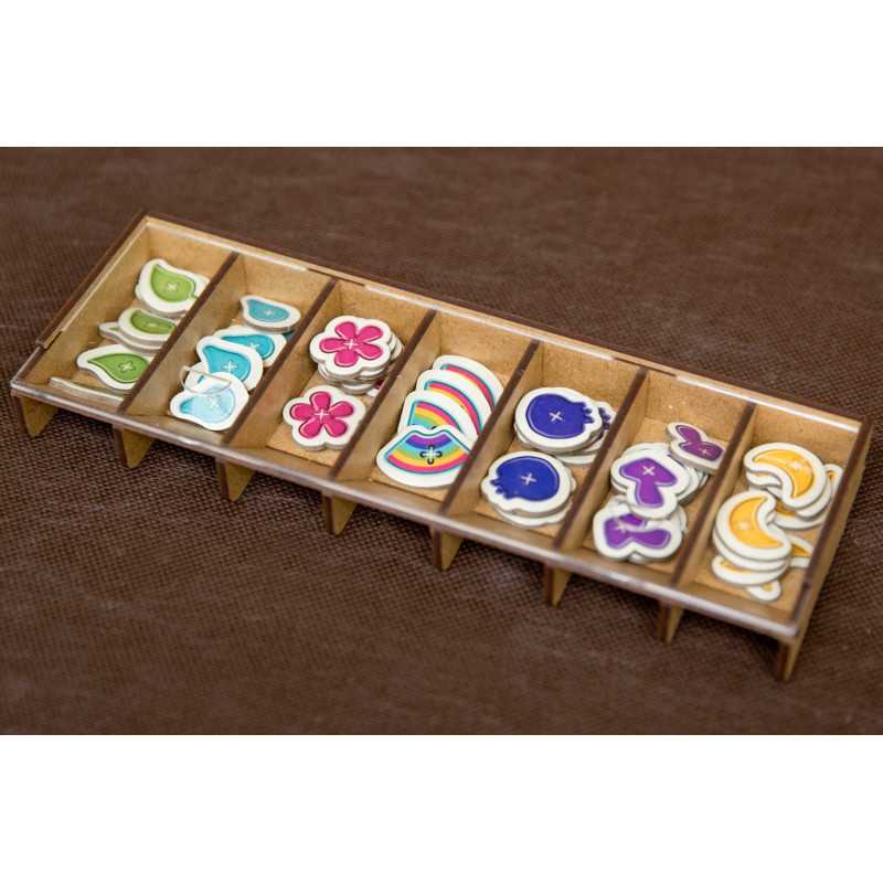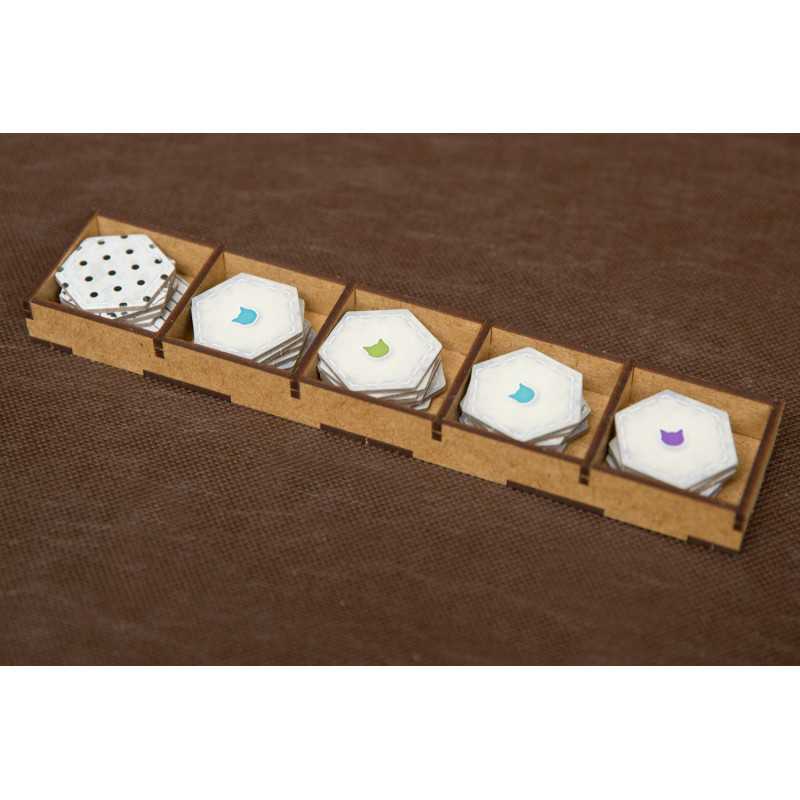 Żetony guzików mają swój własny podajnik, każdy kolor ma oddzielną przegródkę, podajnik jest zasuwany plastikową zasuwką. W zestawie znajdują się dwa pojemniki na żetony kotów, każdy kot ma swoją oddzielną przegródkę, pudełka są zasuwane plastikową zasuwką. Ponadto w zestawie jest pojemnik na sześciokątne żetony startowe i żetony materiałów oraz dwa pojemniki do przechowywania kafli kotów, kafla punktacji i reszty rzeczy znajdujących się w wyposażeniu gry.
