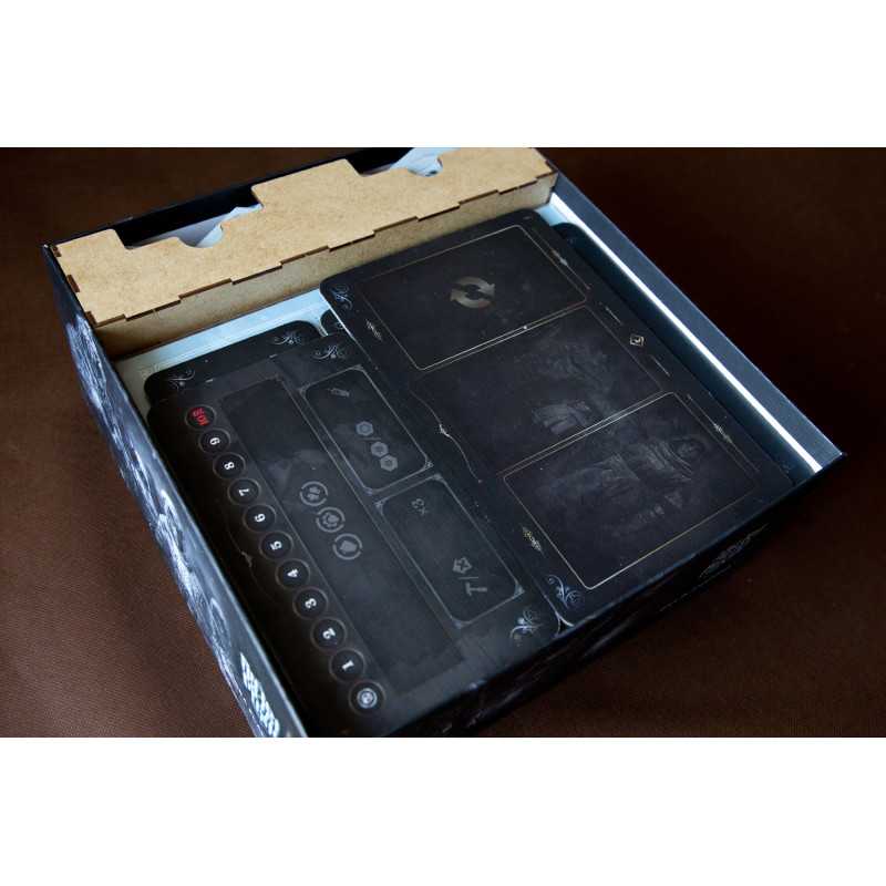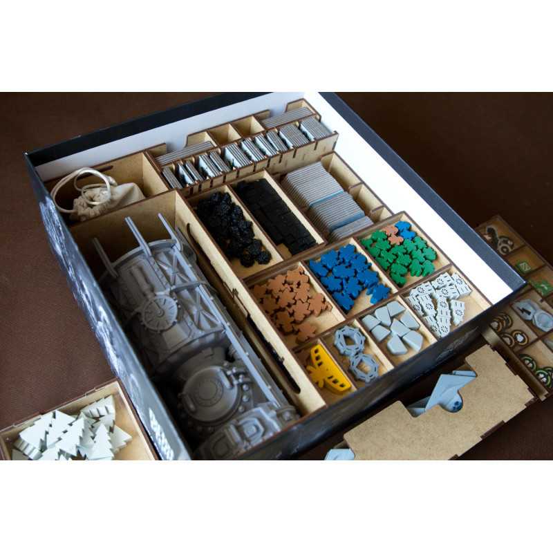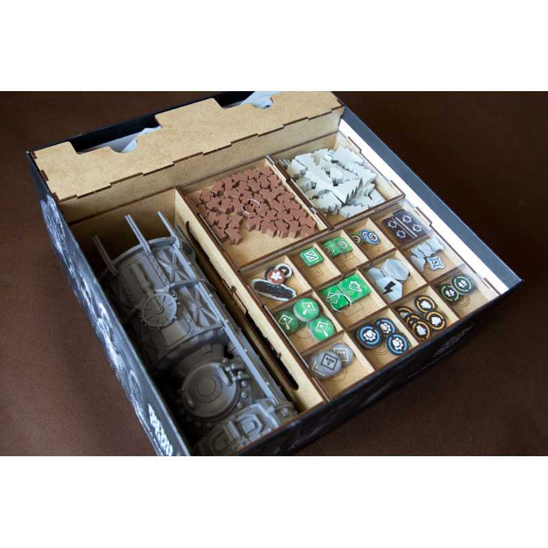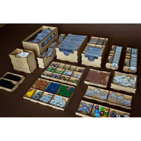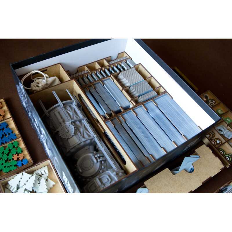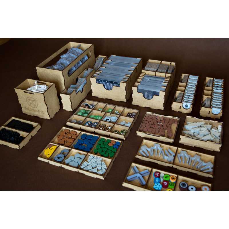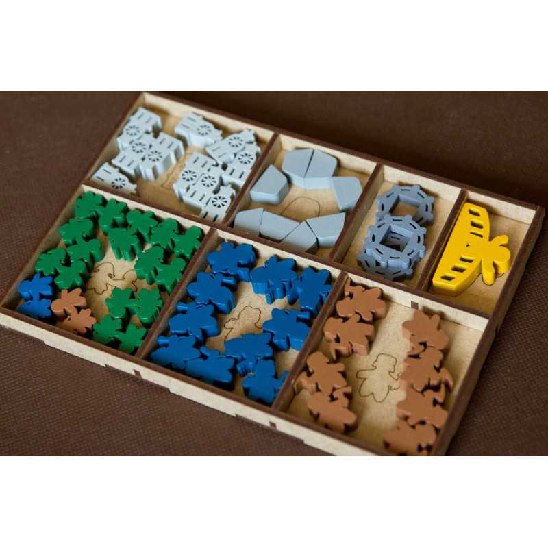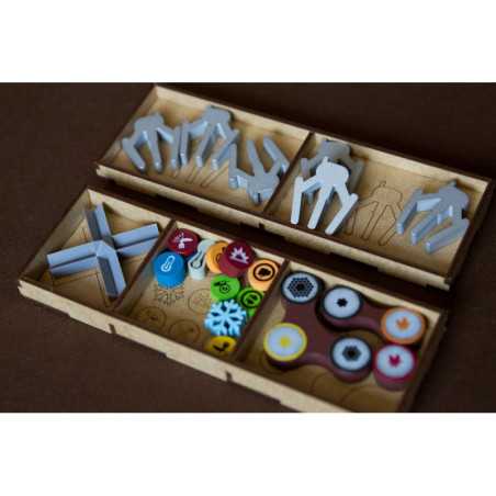 Pojemniki w insercie posiadają grawery ułatwiające posegregowanie elementów. Woreczki przechowywane są razem z żetonami tekturowymi / drewnianymi w środku, nie trzeba ich wysypywać. Wierzchnie pojemniki są zasuwane co pozwala na pionowe przechowywanie pudełka.
