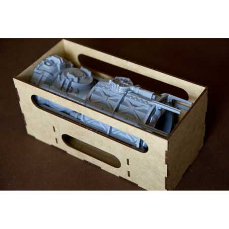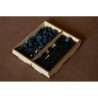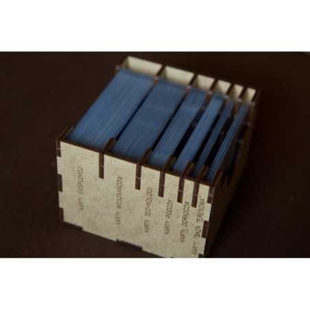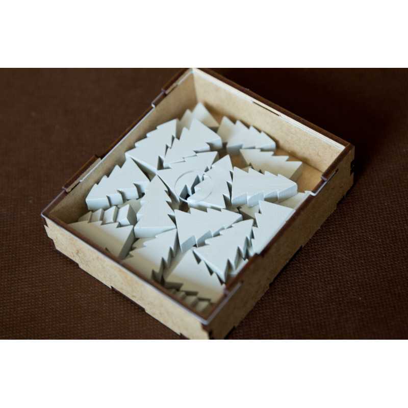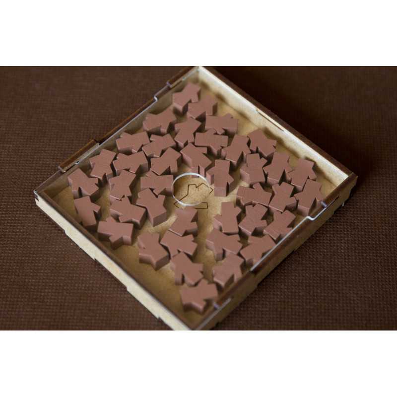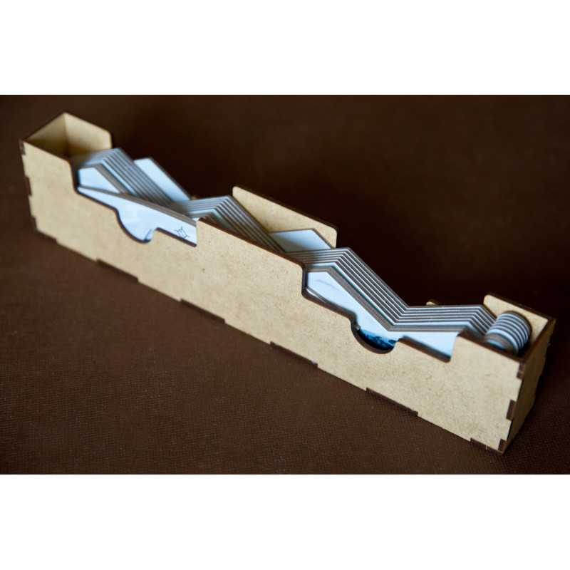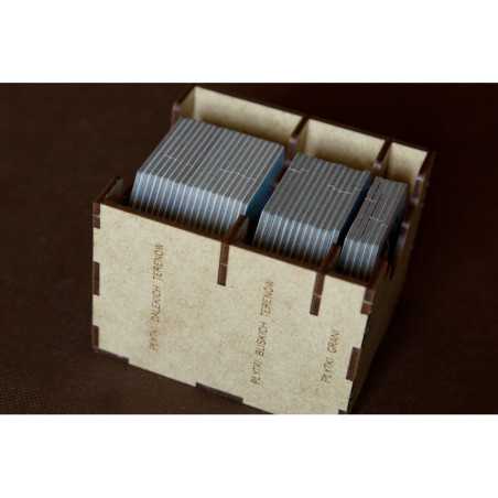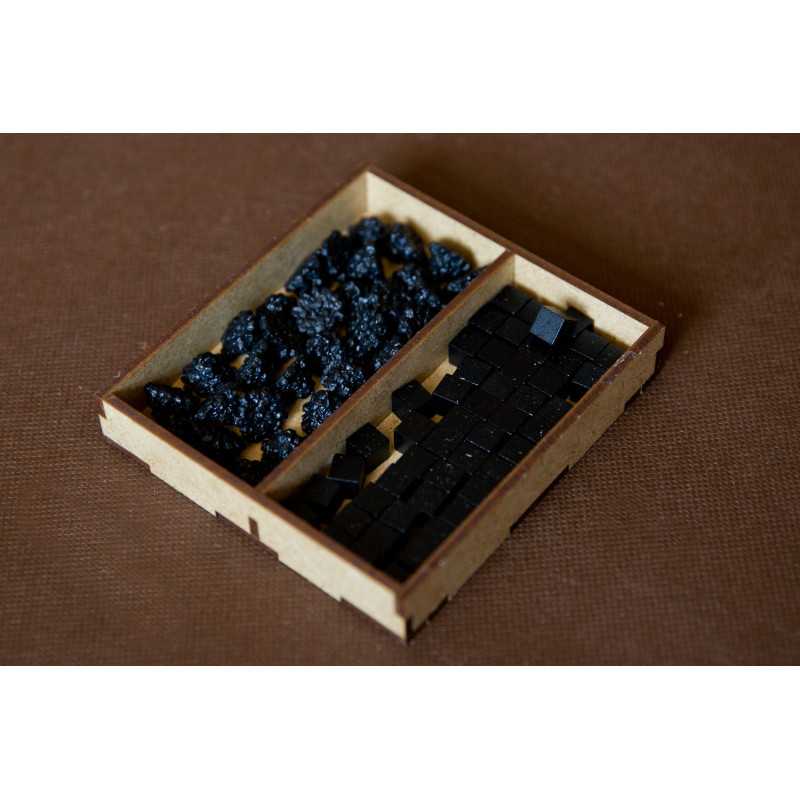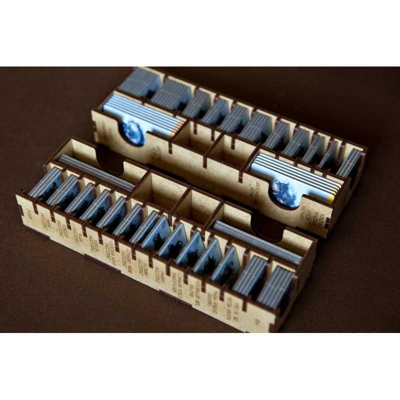 Pojemniki w insercie posiadają grawery ułatwiające posegregowanie elementów. Woreczki przechowywane są razem z żetonami tekturowymi / drewnianymi w środku, nie trzeba ich wysypywać. Wierzchnie pojemniki są zasuwane co pozwala na pionowe przechowywanie pudełka.
