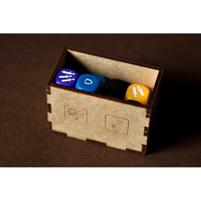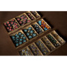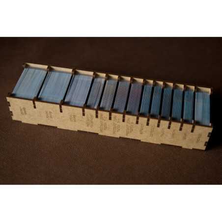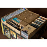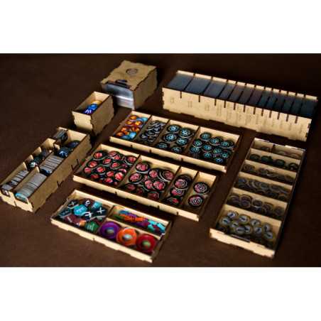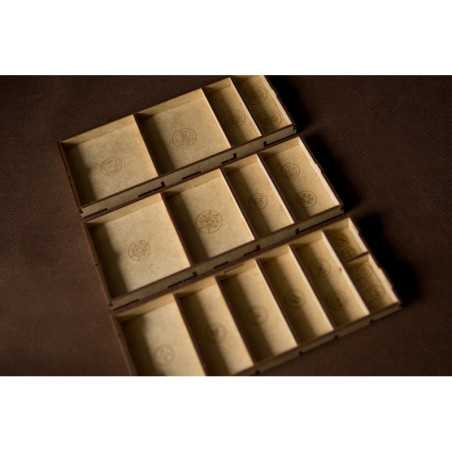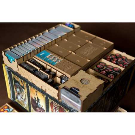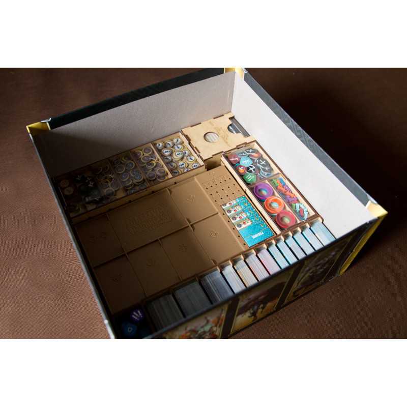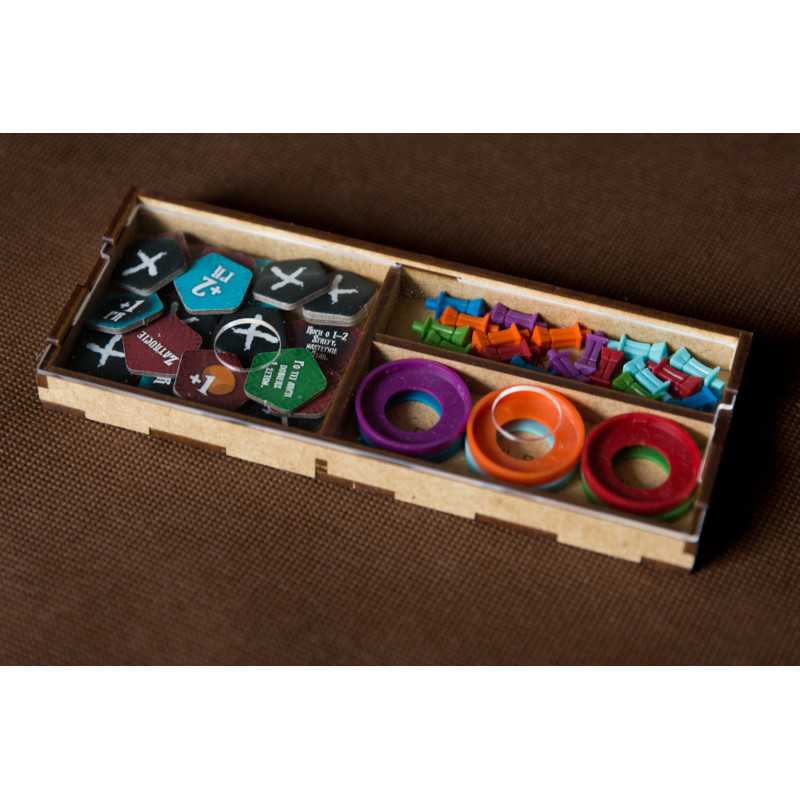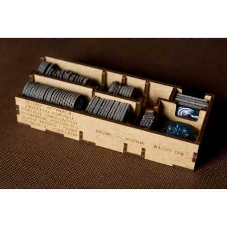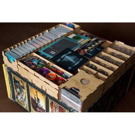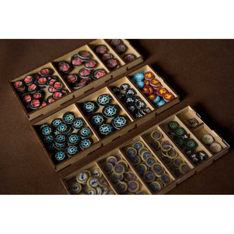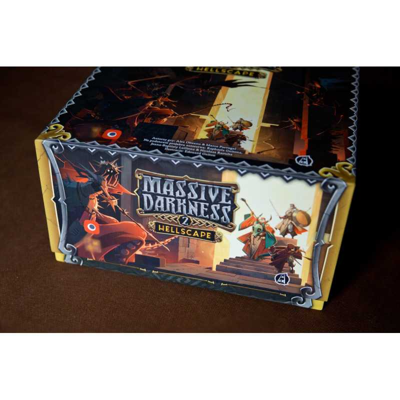 Insert pasujący do gry typu "dungeon crawler" Massive Darkness 2 Hellscape. Insert mieści karty w koszulkach klasy Premium (do 110 mikronów). Na zdjęciach karty w koszulkach Portal Games 100 mikronów. Pojemniki na żetony i znaczniki pełnią również funkcję tacek do wyłożenia na stół. Figurki oraz 12 kart Grasujących Potworów przechowywane są w oryginalnym plastikowm organizerze.