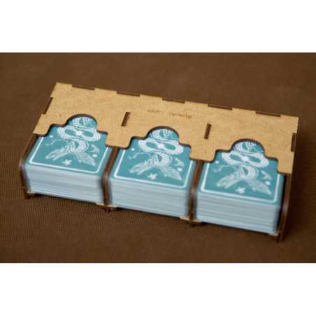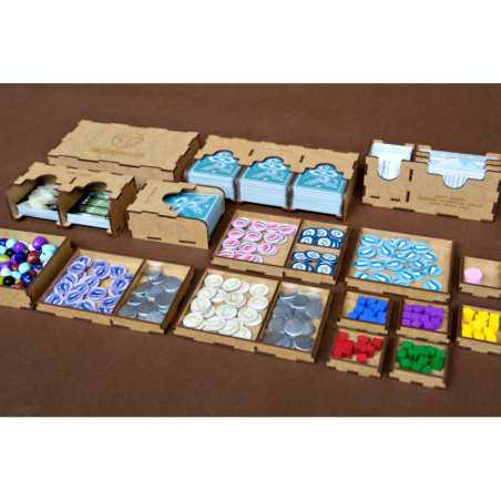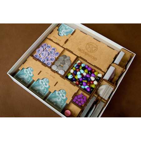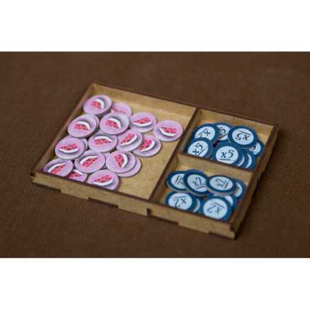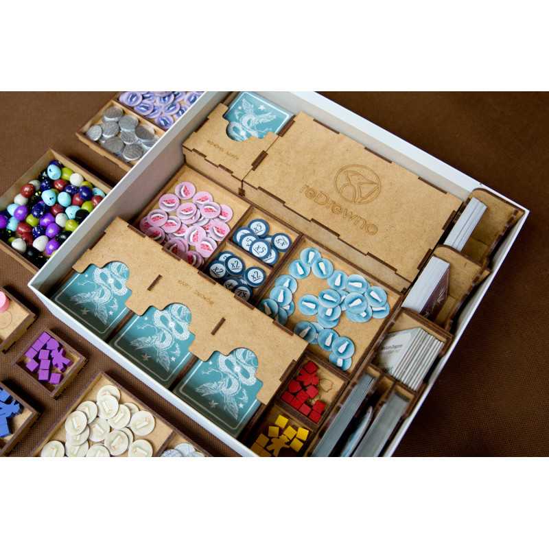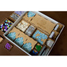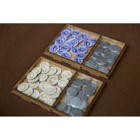 Insert zawiera pojemniki do wyłożenia na stół, które ułatwiają rozgrywkę i pomagają utrzymać porządek: