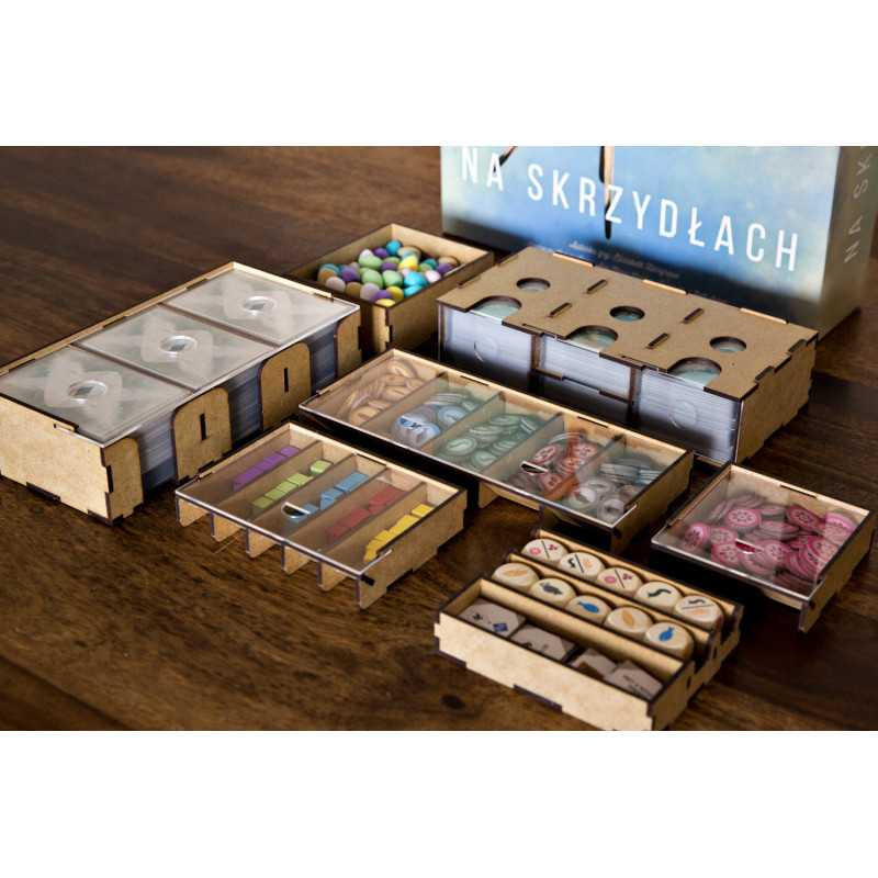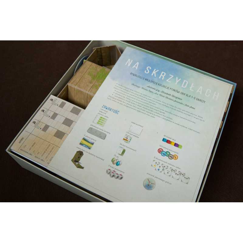 Insert pasujący do gry Na skrzydłach z dodatkiem Ptaki Europy oraz Ptaki Oceanii. Na zdjęciach przedstawiono przykładowe zastosowanie dla gry podstawowej wraz z dodatkami. Insert pomieści karty w koszulkach klasy PREMIUM o grubości do 100 mikronów (na zdjęciach karty w koszulkach Gamegenic Prime).