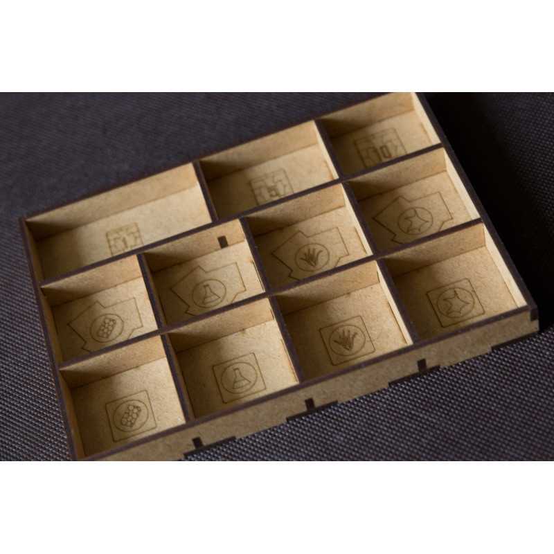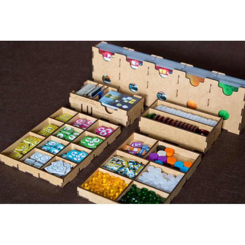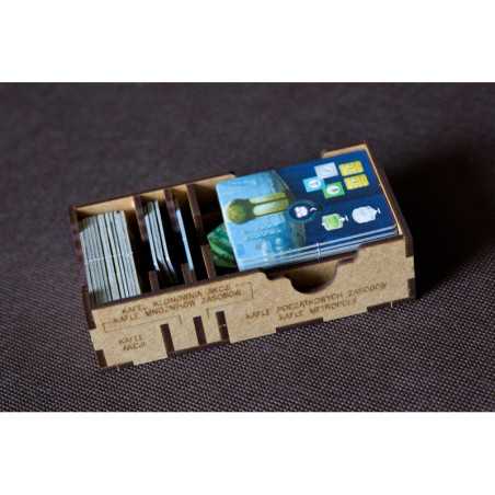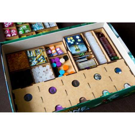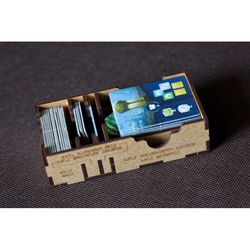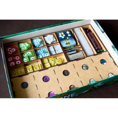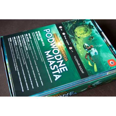 Insert pasujący do gry Podwodne Miasta z dodatkiem Nowe Odkrycia oraz kartami promo (dostępnymi w sklepie Portal Games). Pudełko zamyka się bez uniesienia wieka.