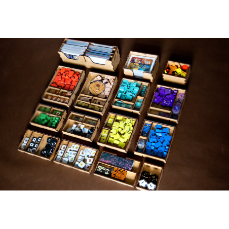 Uwaga: Do spakowania gry wymagane jest pudełko do podstawowej wersji gry oraz jedno pudełko z dużego dodatku. W pudełku z podstawki mieści się insert i 8 planszetek frakcji. Pozostałem planszetki, dwie plansze oraz instrukcje przechowywane są w pudełku po dodatku. Możliwe jest włożenie do pudełka po podstawce np. 1 planszy, 2-3 planszetki, instrukcje.