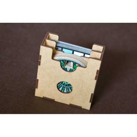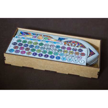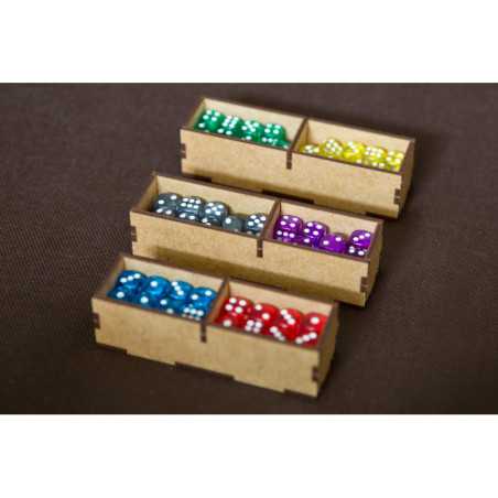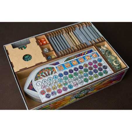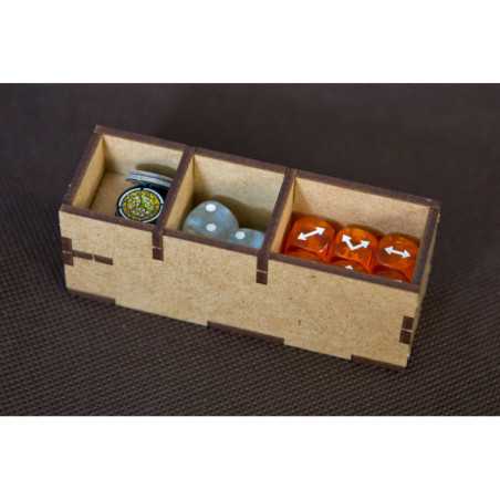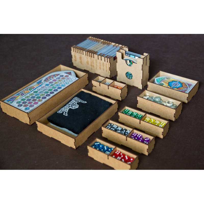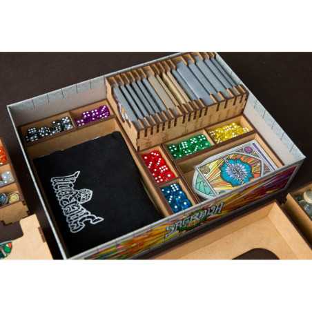 Insert jest tak skonstruowany, że nie ma potrzeby opróżniania worka z wsypanej puli kości zależnej od ilości graczy - ilość kości przechowana w worku od 50 (2 graczy) do 130 kości (6 graczy). Pozostałe kości przy ilości 2-5 graczy są przechowane w pojemnikach (podzielone na kolory). Pojemnik na karty umożliwia podzielenie kart według rodzajów oraz dodatków.