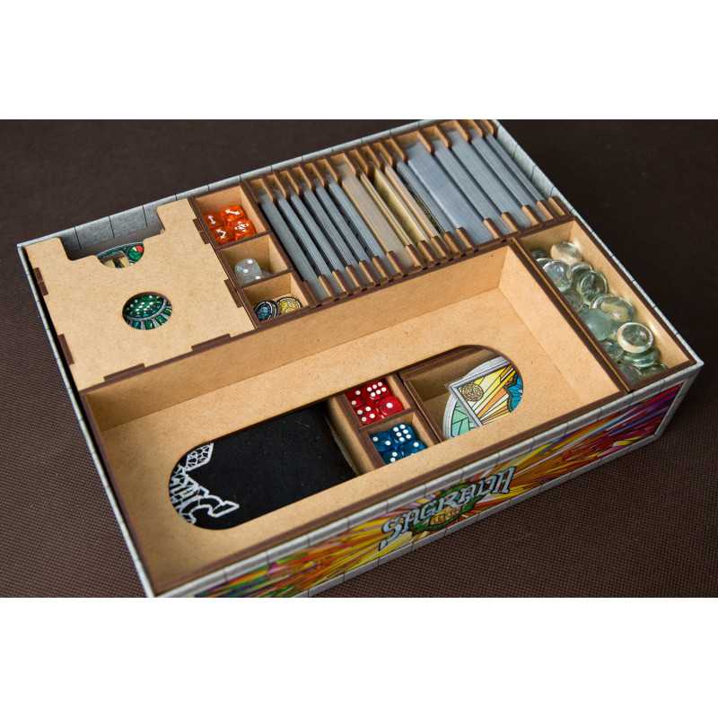 Insert pasujący do gry familijnej Sagrada z czterema dodatkami. Insert mieści karty w koszulkach klasy PREMIUM o grubości do 110 mikronów (na zdjęciach w koszulkach Rebel Premium - grubość 90 mikronów). Insert jest niezależny od posiadanych dodatków.