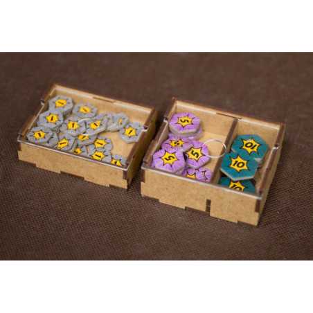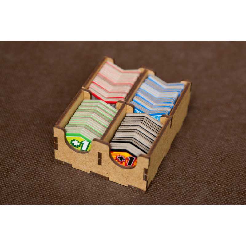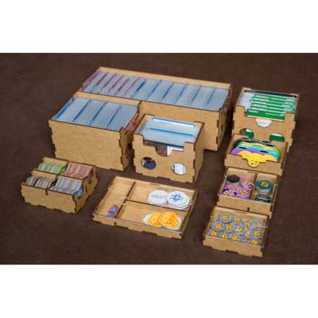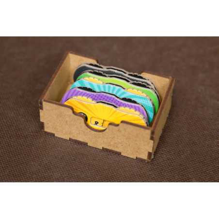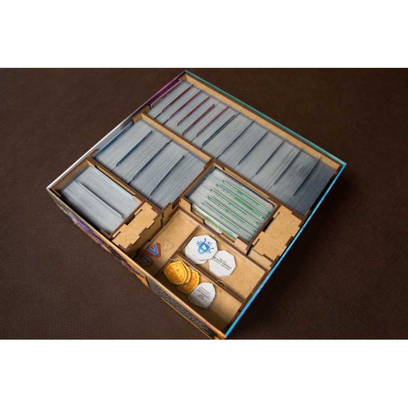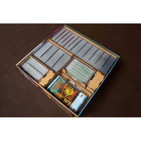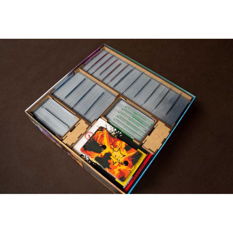 Insert pasujący do gry karcianej Sentinels of the Multiverse: Definitive Edition. Insert mieści karty CCG (talie: Bohaterów, Łotrów, Środowiska) w koszulkach klasy Premium (do 100 mikronów). Na zdjęciach karty CCG w koszulkach Portal Games (100 mikronów) oraz karty przekładek w koszulkach Gamegenic Square Prime (100 mikronów). Pozostałe karty przechowywane są bez koszulek. Pojemniki na żetony i znaczniki pełnią również funkcję tacek do wyłożenia na stół. Pudełko zamyka się całkowicie. Insert mieści alternatywne drewniane żetony punktów życia sprzedawane w zestawie z grą w przedsprzedaży w sklepie Portal Games.