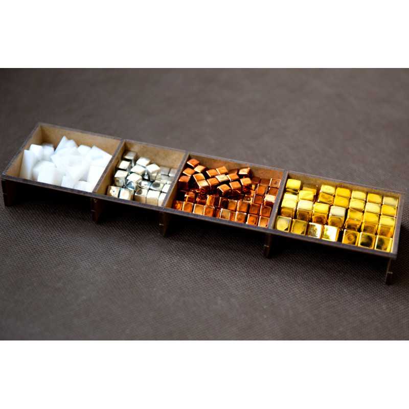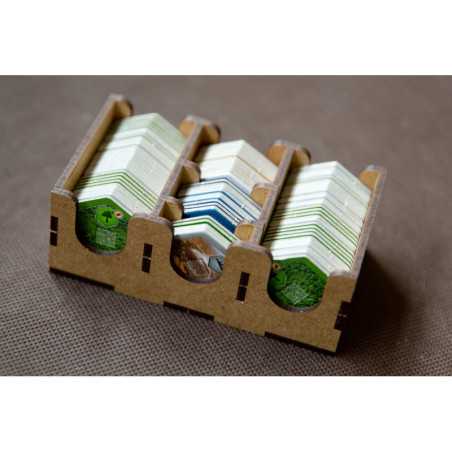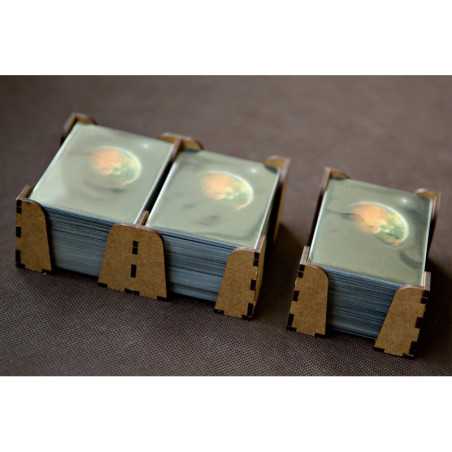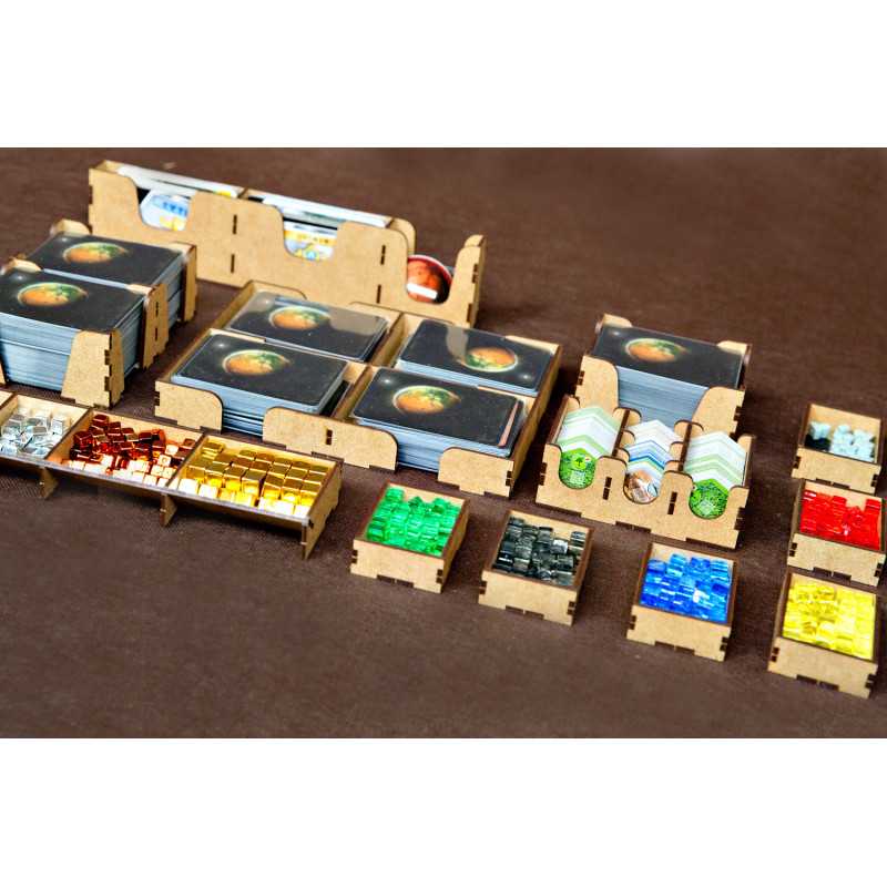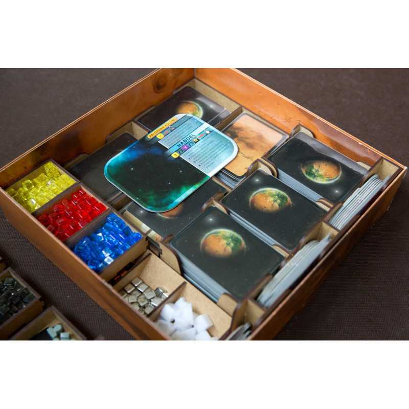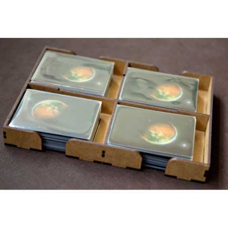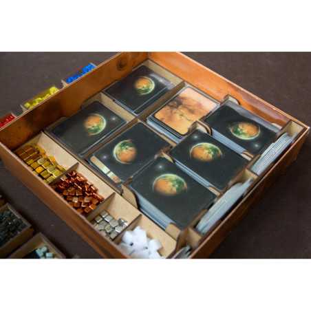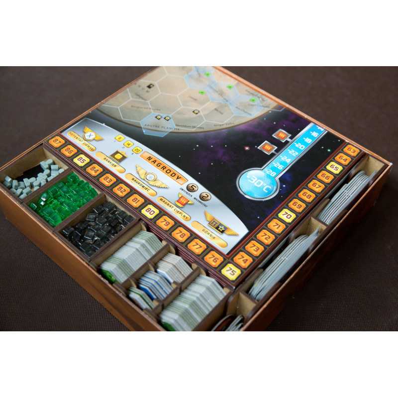 Insert pasujący do gry Terraformacja Marsa. Insert mieści wszystkie dodatki, które wyszły w wersji polskiej (wg listy poniżej). W środku są dwa podajniki na karty. Jeden podwójny i jeden pojedynczy. Ułożenie kart jest poziome z uwagi na ilość kart i ich objętość w koszulkach (na zdjęciu karty bez koszulek). Karty wejdą w koszulkach Premium o grubości maksymalnej 100 mikronów np. Premium Rebel - 90 mikronów lub Gamegenic PRIME 100 mikronów. Karty w koszulkach grubszych np. Sloyca - 110 mikronów nie zmieszczą się. Z własnego doświadczenia zalecamy Rebel Premium, dadzą Wam pełen komfort użytkowania insertu.