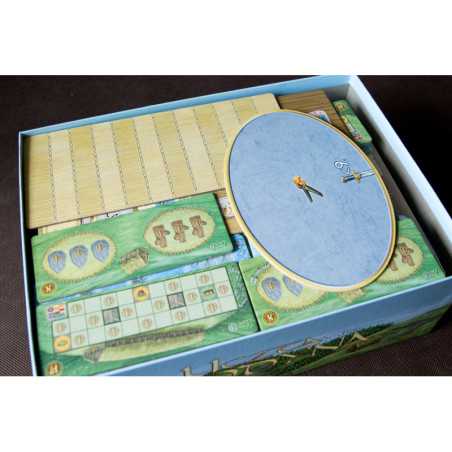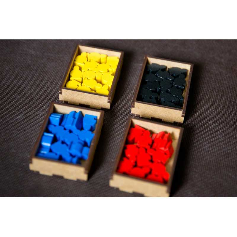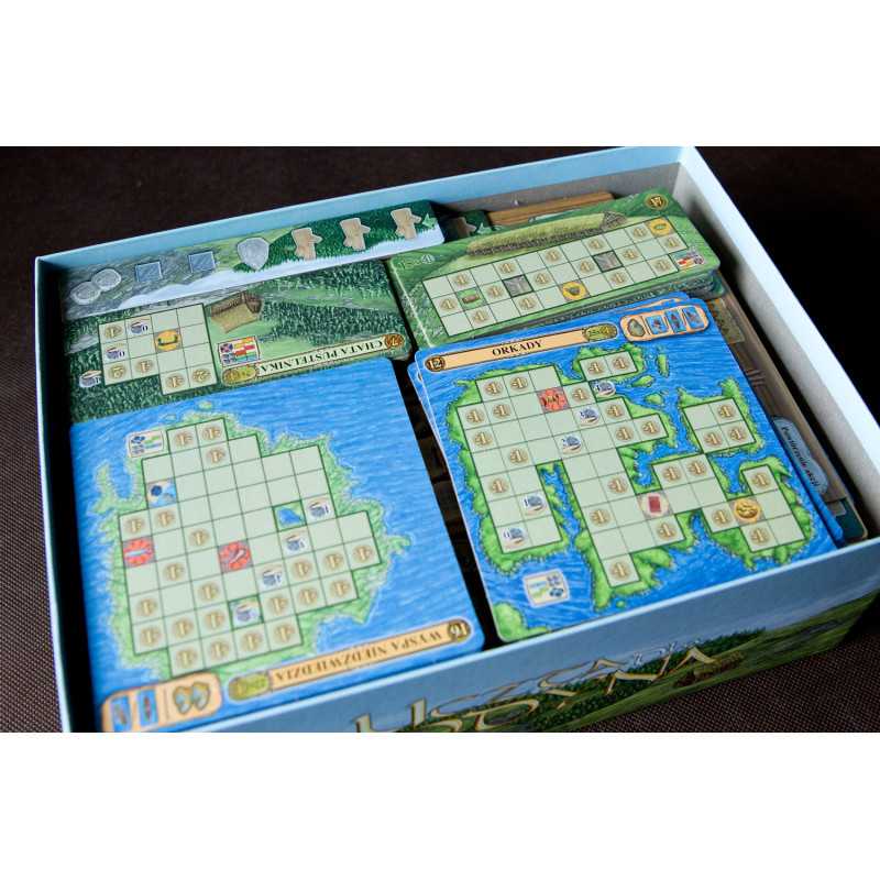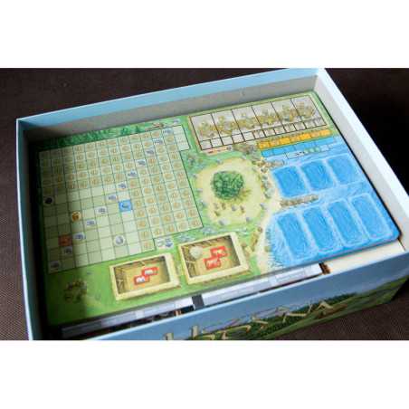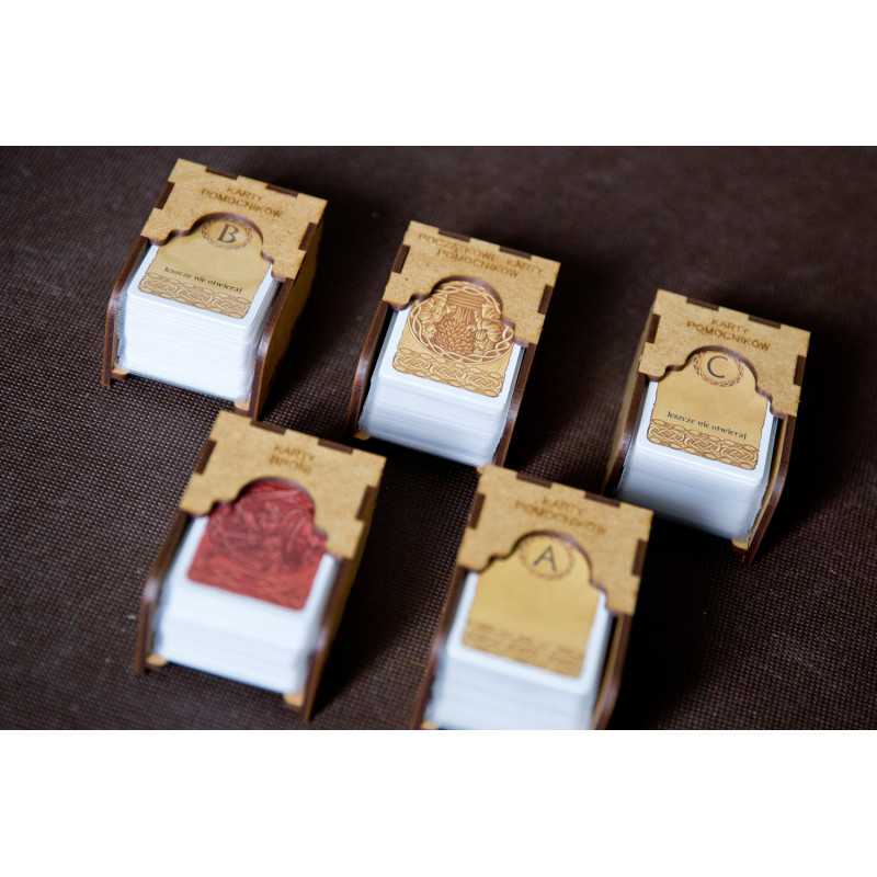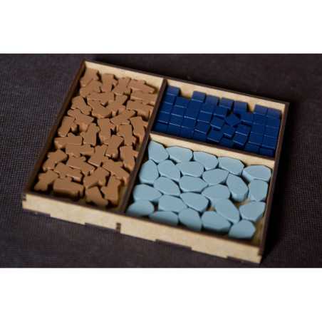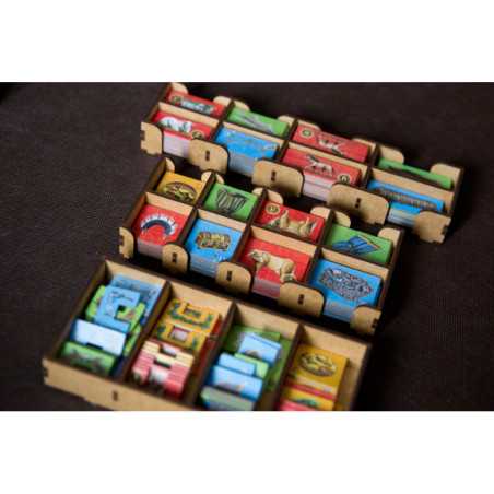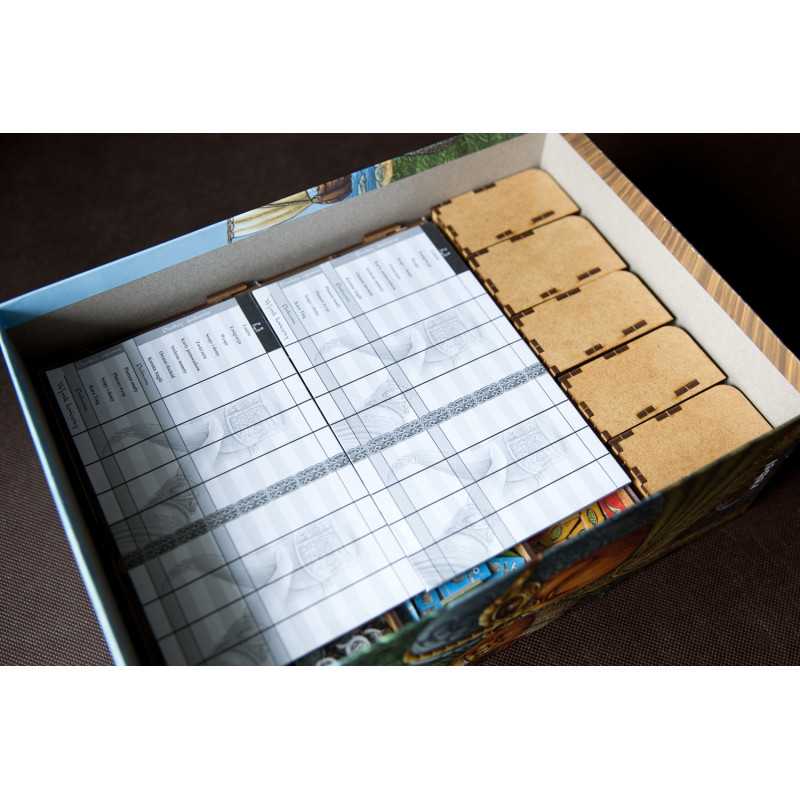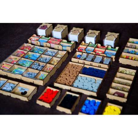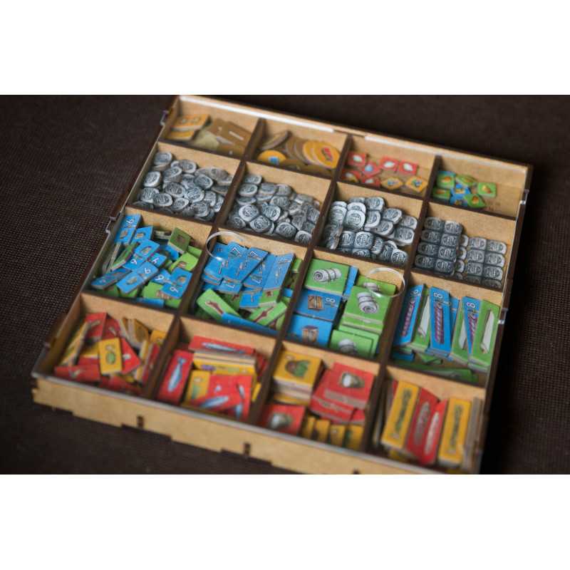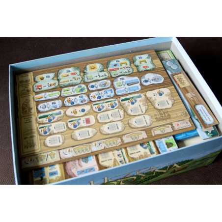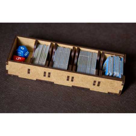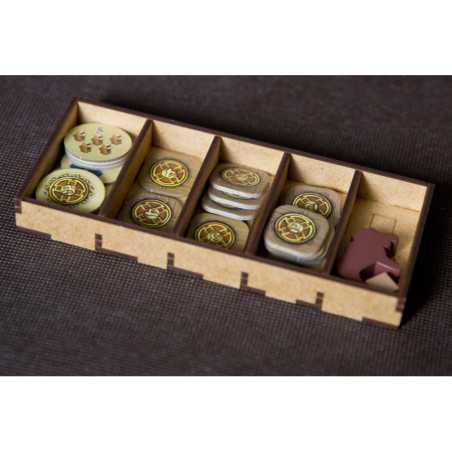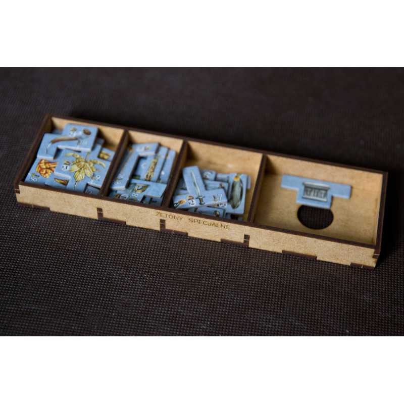 Insert jest tak zaprojektowany, żeby wszystkie żetony reprezentujące żetony dóbr oraz inne znaczniki użytkowane w grze były łatwo dostępne podczas gry w wyłożonych tackach na stół. Duże żetony są stakowane w stosach na płasko (łatwe pobieranie i układanie), natomiast drobne żetony są przechowywane bez ich układania. Pojemniki na karty umożliwiają podzielenie kart Pomocników na talie A / B / C, talię Broni oraz talię kart pomocniczych. Wierzchni pojemnik z żetonami jest zasuwany co zabezpiecza przed wysypywaniem się drobnych żetonów podczas transportu lub przechowywania pudełka w pionie.