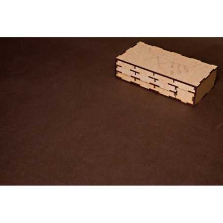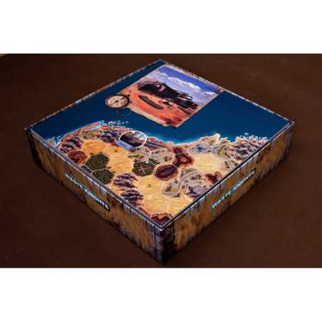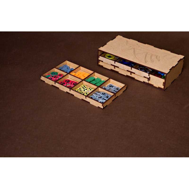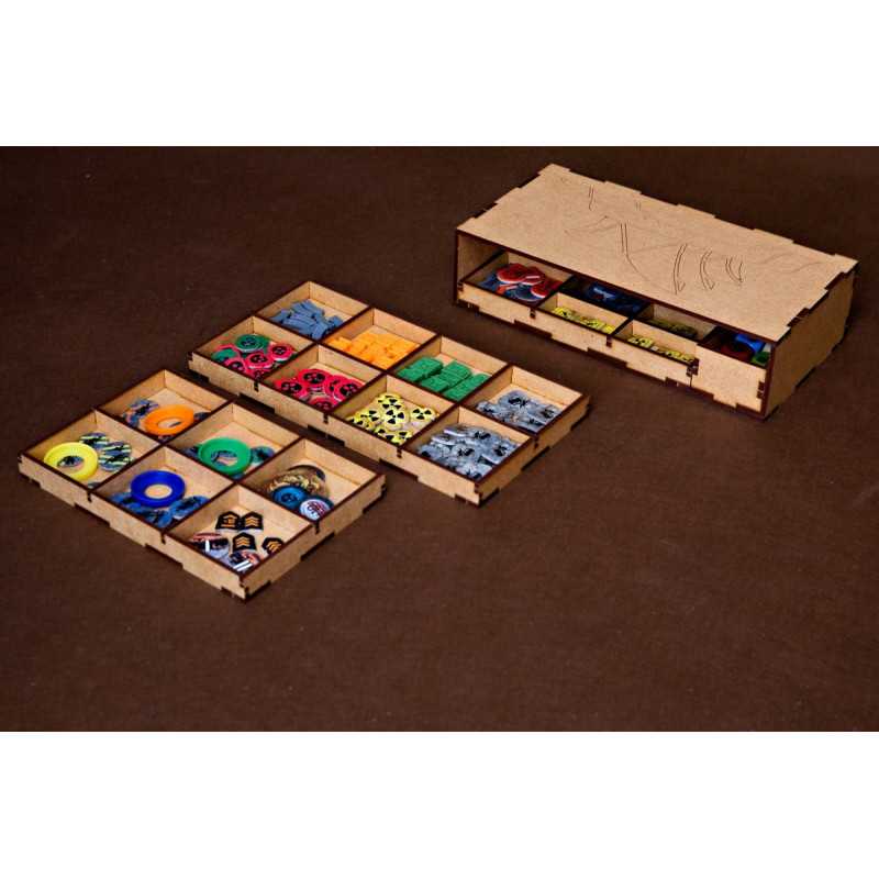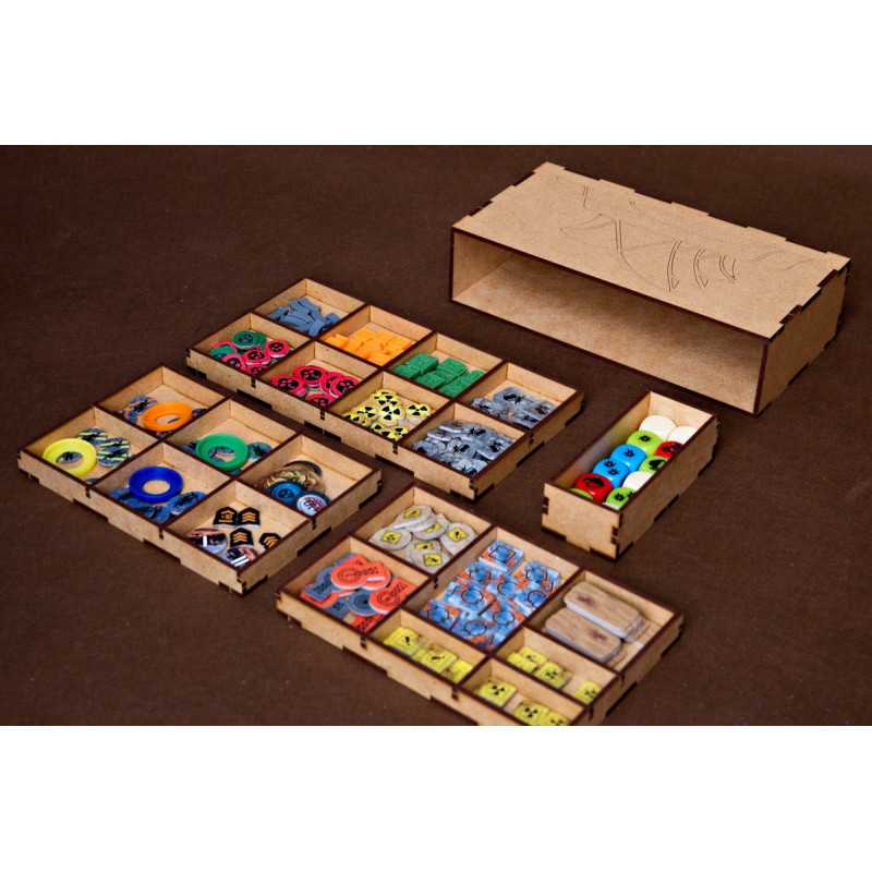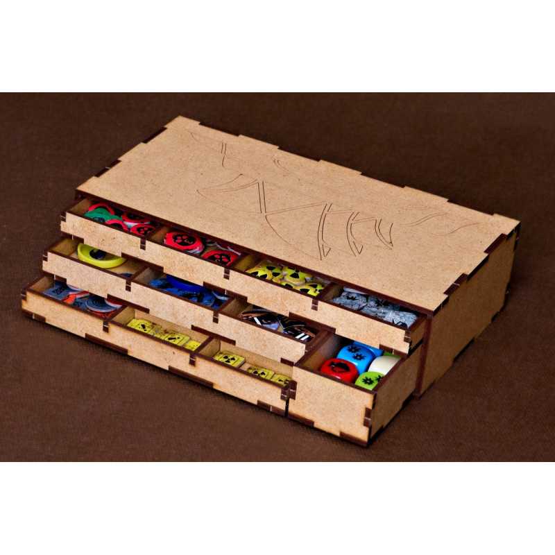 Pojemnik na karty Pustkowi (dwa rodzaje), karty Eksploracji oraz karty Specjalne posiada zasuwkę z pleksi. Trzy pojemniki na żetony i pojemnik na kostki są wsuwane do dużego pojemnika i tak przechowywane w pudełku. Takie rozwiązanie umożliwia przechowywanie pudełka w pionie i zawartość pojemników nigdy się Wam nie wysypie.