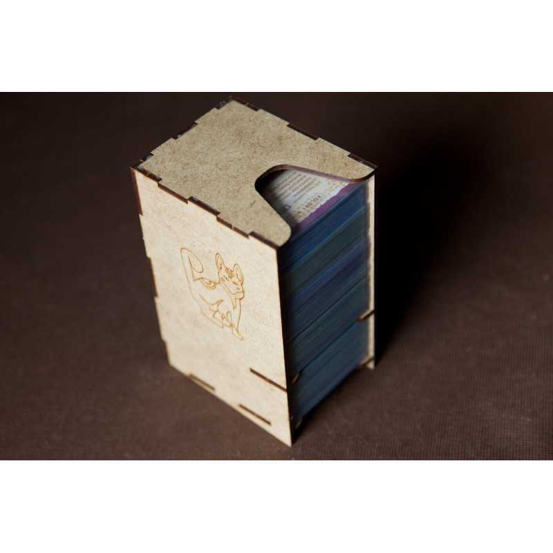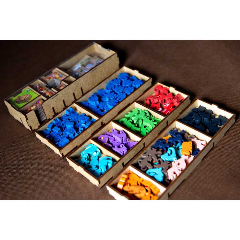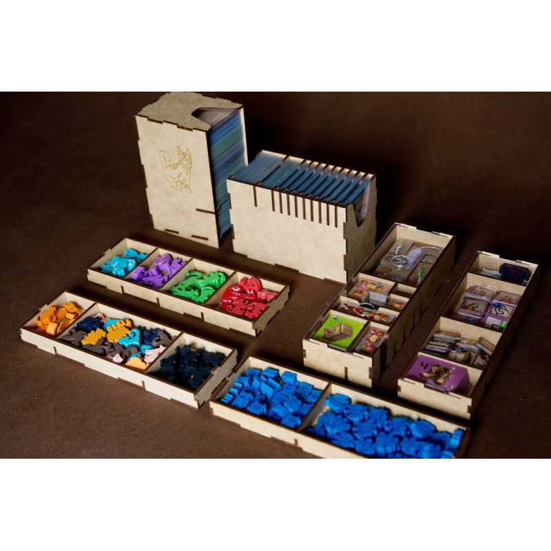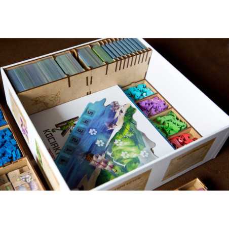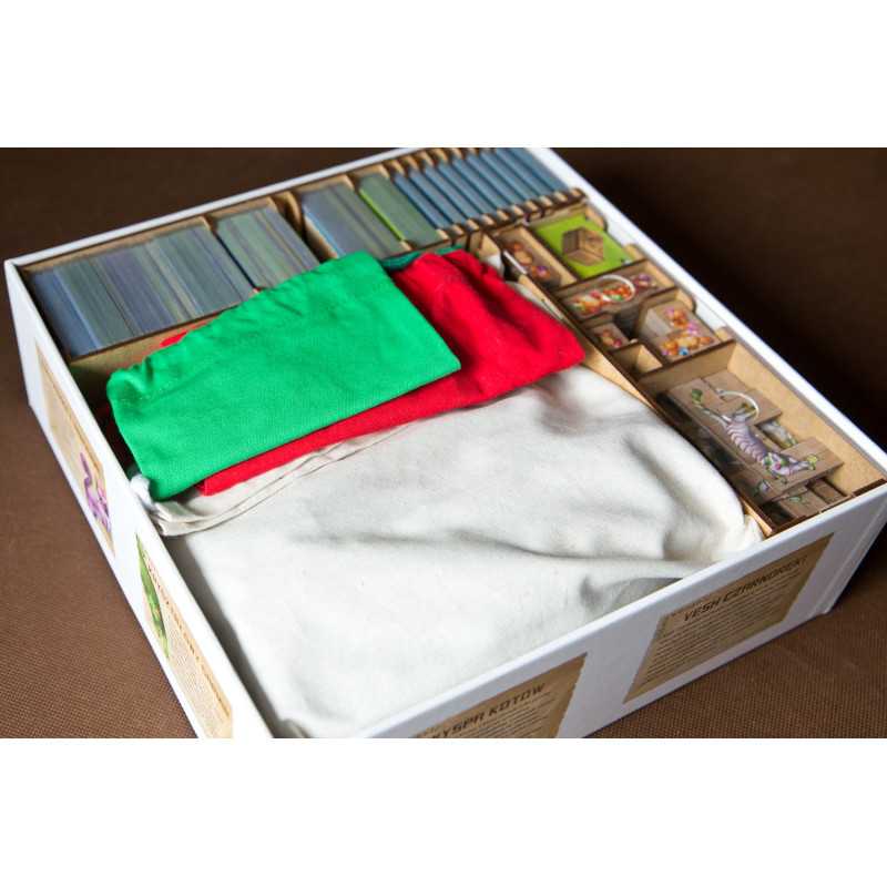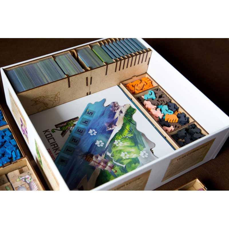 Insert pasujący do gry rodzinnej Wyspa Kotów z dodatkami Wszystkie Łapy na Pokład, Kociaki i Bestie, Pakiet z Kickstartera 1, kafelki promocyjne. Insert pasuje do polskiego wydania gry (Lucky Duck Games) oraz do wersji z Kickstartera (2019). Insert pomieści karty w koszulkach klasy Premium o grubości do 110 mikronów.