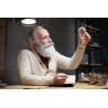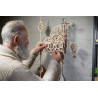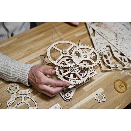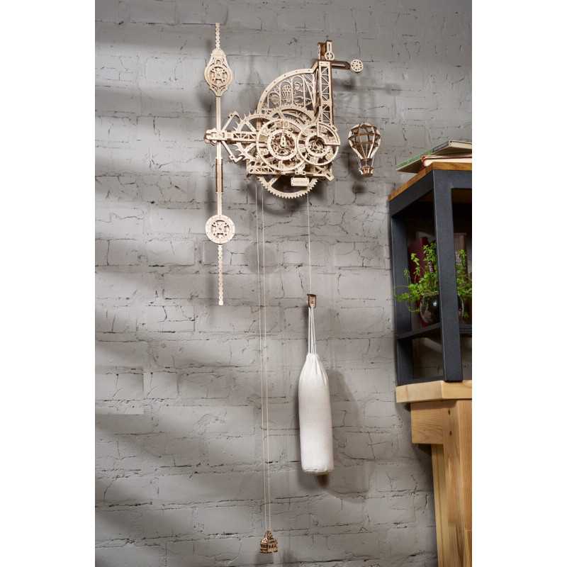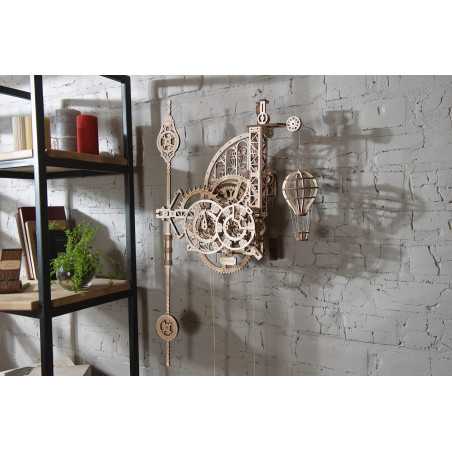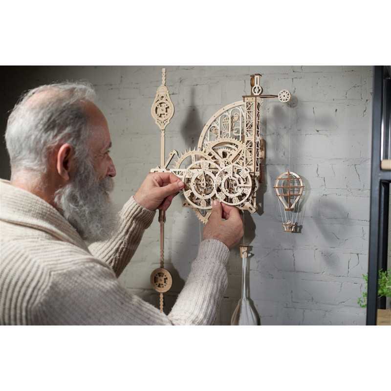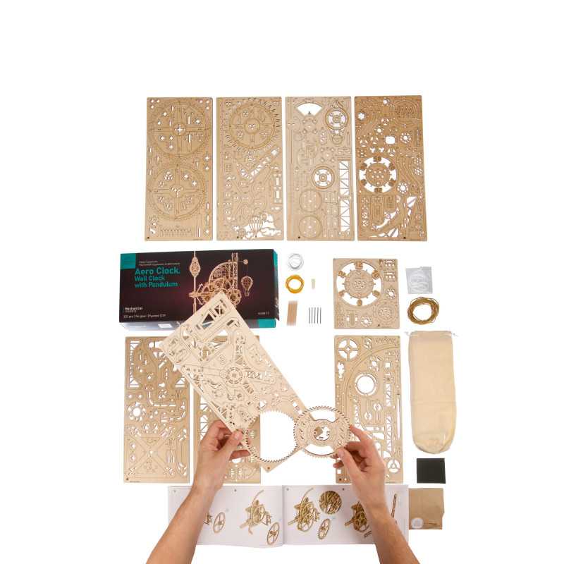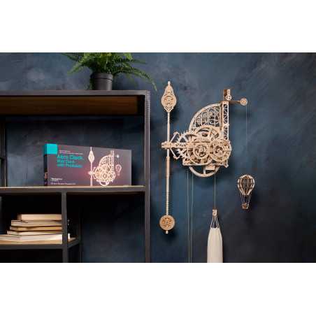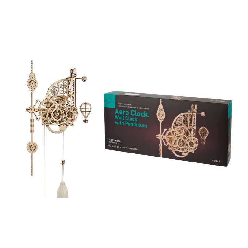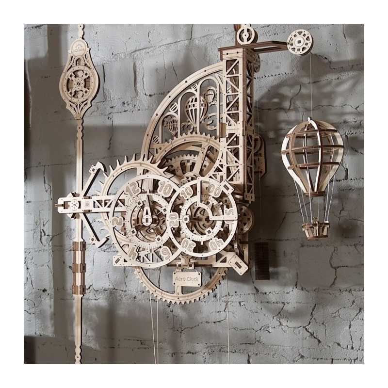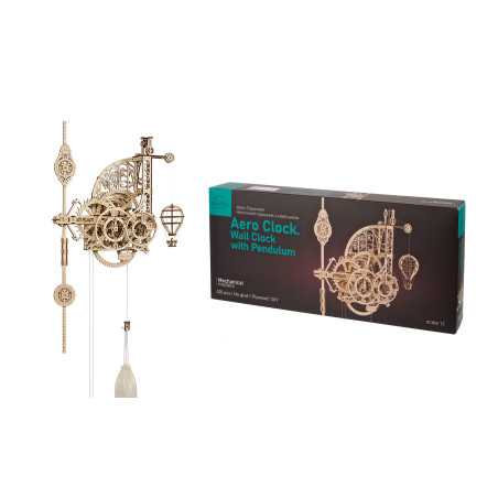 W Ugears pragnęliśmy, by stworzony przez nas model zegara ściennego był nie tylko atrakcyjnym wizualnie elementem wystroju wnętrza. Przede wszystkim dążyliśmy do tego, by stworzyć w pełni działający czasomierz w formacie 3D, który będzie można samodzielnie zbudować, a następnie zawiesić na ścianie i nakręcić, z satysfakcją podziwiając efekt swojej pracy. Aero Clock to nasz najbardziej dopracowany i wyjątkowo pomysłowy model mechaniczny niepodobny do żadnego innego zegara. Stanowi projekt łączący w sobie kunszt inżynierski z artystyczną wizją. Obudowa w stylu steampunk umożliwia obserwowanie działania mechanizmu wewnątrz wahadłowego zegara. Jak wszystkie pozostałe drewniane modele puzzli 3D od Ugears, również zegar został stworzony z perfekcyjnie przyciętych za pomocą lasera elementów, które będą harmonijnie się ze sobą łączyły.