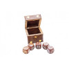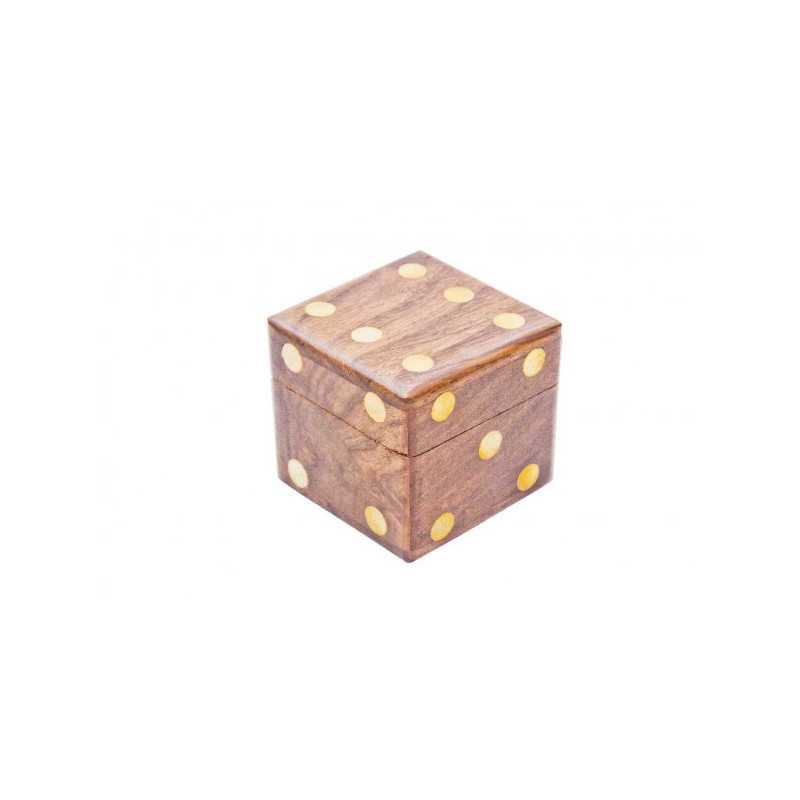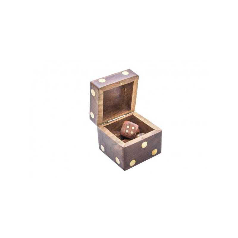 Bardzo wysokiej jakości zestaw do gry w kości wykonany w całości z drewna z drewnianym zamknięciem. Kości oraz pudełko posiada zachowaną strukturę drewna co nadaje wyjątkowego wyglądu i prestiżu. Pudełeczko jest małe i bardzo poręczne do zabrania ze sobą np. na wakacje. Zarówno na pudełku jak i na kościach znajdują się zdobienia wykonane z mosiądzu.